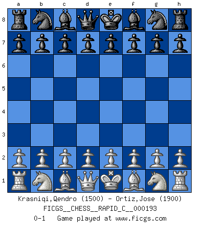 Last move : 0-1 2018 November 21 11:18:33 [Event "FICGS__CHESS__RAPID_C__000193"] [Site "FICGS"] [Date "2018.10.22"] [Round "1"] [White "Krasniqi,Qendro"] [Black "Ortiz,Jose"] [Result "0-1"] [WhiteElo "1500"] [BlackElo "1900"] 0-1 This chess game has been lost on time (started : 2018.10.22 0:41:15) Player Black won this chess game. Follow this game move after move (download)Good positions don't win games, good moves do. (Gerald Abrahams) Modernes Schach erfordert enorme Anspannung. Es ist für einen normalen Menschen unmöglich das auszuhalten. (Viktor Kortschnoi) Con el tiempo, empecé a progresar en partidas decisivas. Tal vez porque me di cuenta de una simple verdad: no solo estaba yo nervioso sino también mi oponente. (Mikhail Tal) Je crois qu'il existe des manières très spécifiques de jouer efficacement contre une machine. Evidemment, nous n'avons aucune chance en technique pure, parce que l'ordinateur calcule de manière parfaite. Mais lorsque nous faisons appel à notre cerveau, en utilisant l'intuition et la compréhension, alors nous restons beaucoup plus forts. (Anatoli Karpov) The production of too many useful things results in too many useless people. (Karl Marx)