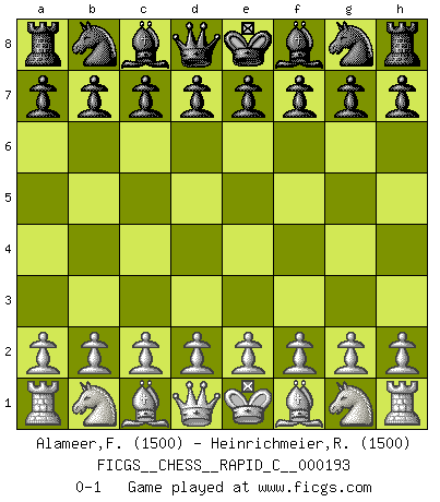 Last move : 0-1 2018 November 21 11:18:33 [Event "FICGS__CHESS__RAPID_C__000193"] [Site "FICGS"] [Date "2018.10.22"] [Round "1"] [White "Alameer,Fared"] [Black "Heinrichmeier,Roland"] [Result "0-1"] [WhiteElo "1500"] [BlackElo "1500"] 0-1 This chess game has been lost on time (started : 2018.10.22 0:41:15) Player Black won this chess game. Follow this game move after move (download)White lost because he failed to remember the right continuation and had to think up the moves himself. (Siegbert Tarrasch) Ein Buch ist ein Spiegel; wenn ein Affe hineinsieht, so kann kein Apostel heraus gucken. (Georg Christoph Lichtenberg) Cada Peón es una Reina en potencia. (James Mason) Le succès, c'est être capable d'aller d'échec en échec sans perdre son enthousiasme. (Winston Churchill) The problem with manipulation is that people can turn on you. (Horatio Caine, C.S.I. Miami)