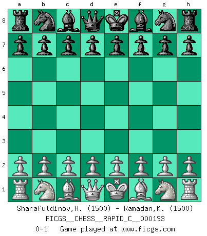 Last move : 0-1 2018 November 21 11:18:33 [Event "FICGS__CHESS__RAPID_C__000193"] [Site "FICGS"] [Date "2018.10.22"] [Round "1"] [White "Sharafutdinov,Husniddin"] [Black "Ramadan,Khaled"] [Result "0-1"] [WhiteElo "1500"] [BlackElo "1500"] 0-1 This chess game has been lost on time (started : 2018.10.22 0:41:15) Player Black won this chess game. Follow this game move after move (download)Before the endgame, the Gods have placed the middle game. (Siegbert Tarrasch) Ich verstehe mehr vom Schach als irgendein anderer lebender Meister. (José Raúl Capablanca) Una partida de Ajedrez se divide en 3 etapas: la primera cuando piensas que tienes la ventaja, la segunda cuando crees que tienes la ventaja y la tercera... ¡cuando te das cuenta que vas a perder!. (Savielly Tartakower) Tout change constamment, y compris dans le monde des Echecs. (Botvinnik) The general who wins the battle makes many calculations in his temple before the battle is fought. The general who loses makes but few calculations beforehand. (Sun Tzu)