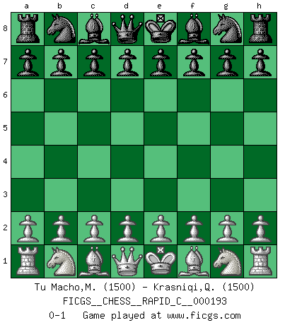 Last move : 0-1 2018 November 21 11:18:33 [Event "FICGS__CHESS__RAPID_C__000193"] [Site "FICGS"] [Date "2018.10.22"] [Round "1"] [White "Tu Macho,Moposita"] [Black "Krasniqi,Qendro"] [Result "0-1"] [WhiteElo "1500"] [BlackElo "1500"] 0-1 This chess game has been lost on time (started : 2018.10.22 0:41:15) Player Black won this chess game. Follow this game move after move (download)Only the player with the initiative has the right to attack. (Wilhelm Steinitz) Es ist im Leben wie im Schachspiel. Wir entwerfen einen Plan, dieser bleibt jedoch bedingt durch das, was im Schachspiel dem Gegner, im Leben dem Schicksal zu tun belieben wird. (Arthur Schopenhauer) Algunos sacrificios son sólidos, los demás son míos. (Mikhail Tal) Lorsque vous vous retrouvez devant une position atroce, ne tendez pas un ultime piège dérisoire avec l'intention d'abandonner si l'adversaire le déjoue ! Faites-vous plutôt un devoir de résister comme si votre vie en dépendait. Jouez le coup qui vous déplairait au centuple si vous étiez dans la peau de votre tortionnaire ! For a mechanic, you seem to do an excessive amount of thinking. (C-3PO in Star Wars ep.2)
