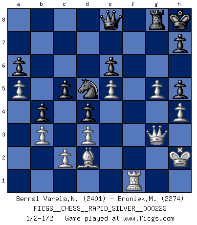 Last move : 1/2-1/2 2019 May 7 13:34:30 [Event "FICGS__CHESS__RAPID_SILVER__000223"] [Site "FICGS"] [Date "2018.10.25"] [Round "1"] [White "Bernal Varela,Nelson"] [Black "Broniek,Mariusz Maciej"] [Result "1/2-1/2"] [WhiteElo "2401"] [BlackElo "2274"] 1.e4 c5 2.Nf3 Nc6 3.Bb5 g6 4.O-O Bg7 5.Re1 Nf6 6.Bxc6 dxc6 7.a4 O-O 8.d3 Ne8 9.e5 Nc7 10.h3 Be6 11.Nc3 b6 12.Qe2 Bd5 13.Nxd5 cxd5 14.Ng5 Qd7 15.Bd2 Rab8 16.f4 f5 17.Qf2 Bh6 18.Nf3 Ne6 19.Qh4 Bg7 20.Qg3 Rbc8 21.Rec1 d4 22.b3 Rc6 23.Kh2 Nc7 24.Rg1 Nd5 25.Raf1 Qd8 26.Re1 a6 27.Qg5 Rc7 28.g4 Rc6 29.Qh4 fxg4 30.Rxg4 Rf5 31.Qf2 e6 32.Ng5 Bh6 33.Ne4 Qf8 34.Rf1 b5 35.Ng3 Rf7 36.a5 Bg7 37.Qe2 R6c7 38.h4 Bh6 39.Qe4 Rg7 40.Qf3 Rcf7 41.Ne4 Rf5 42.Nd6 Rh5 43.Qe2 Qe7 44.Kh3 b4 45.Qf3 Kh8 46.Qf2 Rg8 47.Rg5 Qd7 48.Qg3 Bf8 49.Ne4 Be7 50.Rxh5 gxh5 51.Ng5 Bxg5 52.fxg5 Qe8 53.Kh2 1/2-1/2 Sicilian : Nimzovich-Rossolimo attack (with ...g6, without ...d6) Kingside Castling by player White (move 4) Kingside Castling by player Black (move 7) This chess game ended in a draw. Follow this game move after move (download)The game of Chess is not merely an idle amusement; several very valuable qualities of the mind are to be acquired and strengthened by it, so as to become habits ready on all occasions; for life is a kind of Chess. (Benjamin Franklin) Obendrein hat der FIDE-Präsident den Revolutionsführer Gaddafi zum »Großmeister« ernannt, am Ende der WM. Das ist lächerlich! (Joel Lautier) La belleza de un movimiento no se refleja solo en su apariencia, sino en el pensamiento detrás de él. (Siegbert Tarrasch) Psychologiquement, tu dois avoir confiance en toi même, mais cette confiance doit être basée sur des faits. (Robert Fischer) I don't know, I don't care, and it doesn't make any difference. (Albert Einstein)