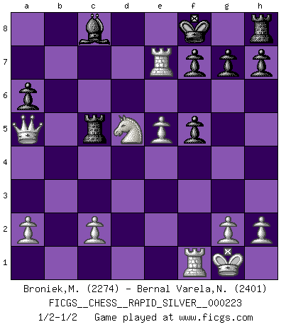 Last move : 1/2-1/2 2019 January 17 14:13:38 [Event "FICGS__CHESS__RAPID_SILVER__000223"] [Site "FICGS"] [Date "2018.10.25"] [Round "2"] [White "Broniek,Mariusz Maciej"] [Black "Bernal Varela,Nelson"] [Result "1/2-1/2"] [WhiteElo "2274"] [BlackElo "2401"] 1.e4 e6 2.d4 d5 3.Nc3 Nf6 4.e5 Nfd7 5.f4 c5 6.Nf3 cxd4 7.Nxd4 Nc6 8.Be3 Qb6 9.Qd2 Qxb2 10.Rb1 Qa3 11.Bb5 Nxd4 12.Bxd4 a6 13.Bxd7+ Bxd7 14.Rb3 Qe7 15.Rxb7 Rc8 16.O-O Qd8 17.f5 exf5 18.Qd3 Bc5 19.Bxc5 Rxc5 20.Nxd5 Bc8 21.Re7+ Kf8 22.Qa3 Qa5 23.Qxa5 1/2-1/2 French : Steinitz variation Kingside Castling by player White (move 16) This chess game ended in a draw. Follow this game move after move (download)A sacrifice is best refuted by accepting it. (Wilhelm Steinitz) Ich kenne keine einzige Person, die behaupten würde, Garri Kasparow sei ein guter Mensch (Nigel Short) Los Peones son nacidos libres, y aún así, se encuentran por doquier encadenados. (Rick Kennedy) Botvinnik disait en comparant les échecs à la musique: Il existe une science dont le but est l'étude de l'acoustique et des sons. Mais il y a aussi un art qui se sert de l'océan des sons : c'est la musique. De toute évidence, il en est de même pour la pensée. La logique est l'étude des lois de la réflexion et les échecs reflètent, en tant qu'art, le côté logique de la réflexion, sous la forme d'images artistiques... Extrait de Fischer - Spassky, Reykjavik 1972 par Alexander & F. Wyndham (Ed. Solar), p 37. The beginning of wisdom is silence. The second step is listening. (Unknown)