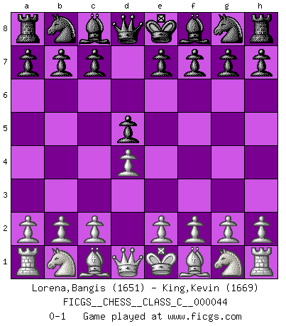 Last move : 0-1 2007 July 2 21:35:37 [Event "FICGS__CHESS__CLASS_C__000044"] [Site "FICGS"] [Date "2007.05.23"] [Round "1"] [White "Lorena,Bangis"] [Black "King,Kevin"] [Result "0-1"] [WhiteElo "1651"] [BlackElo "1669"] 1.d4 d5 0-1 This chess game has been lost on time (started : 2007.05.23 5:41:21) Queen's pawn game Player Black won this chess game. Follow this game move after move (download)The isolated Pawn casts gloom over the entire chessboard. (Aaron Nimzovich) Der Verteidiger gebe der Gewalt nach, aber nur der Gewalt. Er schaffe sich nicht freiwillig, etwa aus Blindheit oder aus Schrecken, irgendwelche Schwächen. Er lasse sich nicht bluffen. (Emanuel Lasker) Solo existe una cosa que Fischer hace en el Ajedrez sin placer: ¡perder!. (Boris Spassky) C'est une question de caractère, Beaucoup de gens perdent leur motivation très vite. D'autres, ils sont rares, peuvent la conserver très longtemps. J'aime les échecs, encore aujourd'hui je suis heureux d'analyser des parties. J'aime toujours gagner, je déteste encore perdre. Bien jouer est important pour mon intégrité intellectuelle et morale. Et puis les échecs vivent en ce moment une période historique grâce à Internet. Ils se développent dans les systèmes éducatifs à travers le monde. Ils sortent de leur ghetto, et c'est mon rôle de mener à bien cette révolution. (Gary Kasparov) The arrogant army will lose certainly the battle. (Chinese proverb)