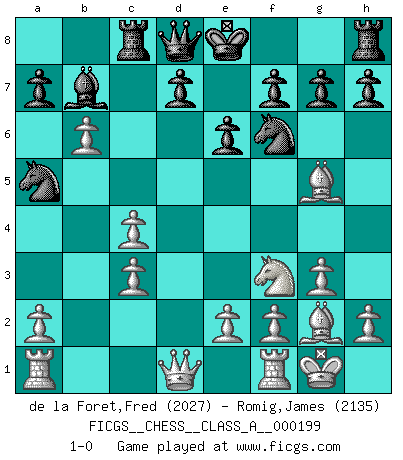 Last move : 1-0 2019 January 17 18:3:8 [Event "FICGS__CHESS__CLASS_A__000199"] [Site "FICGS"] [Date "2018.10.26"] [Round "1"] [White "de la Foret,Fred"] [Black "Romig,James"] [Result "1-0"] [WhiteElo "2027"] [BlackElo "2135"] 1.d4 Nf6 2.c4 e6 3.Nf3 b6 4.g3 Bb4+ 5.Nc3 Bxc3+ 6.bxc3 c5 7.Bg2 Bb7 8.O-O Nc6 9.Bg5 Na5 10.dxc5 Rc8 11.cxb6 1-0 Queen's Indian : 4.g3 Kingside Castling by player White (move 8) Player White won this chess game. Follow this game move after move (download)Chess is in its essence a game, in its form an art, and in its execution a science. (Baron Tassilo) Zum Sieg gelangt man nicht, wenn man gut, sondern nur wenn man besser spielt (Savielly Grigorievitsch Tartakower) Un jugador que trata de regresar una movida en el Ajedrez es un futuro carterista. (Richard Fenton) Je fais ceci parce que dans cinquante coups j'obtiendrai cela; je m'appelle Mikhail Moisevitch Botvinnik. (Botvinnik) Life is pain my dear and anyone who says otherwise is selling something. (Princess Bride)