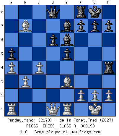 Last move : 1-0 2019 March 5 0:14:8 [Event "FICGS__CHESS__CLASS_A__000199"] [Site "FICGS"] [Date "2018.10.26"] [Round "1"] [White "Pandey,Manoj"] [Black "de la Foret,Fred"] [Result "1-0"] [WhiteElo "2179"] [BlackElo "2027"] 1.e4 c5 2.Nf3 d6 3.d4 cxd4 4.Nxd4 Nf6 5.Nc3 a6 6.Be2 e5 7.Nb3 Be7 8.O-O O-O 9.Be3 Be6 10.Re1 Nbd7 11.a4 Rc8 12.Bf3 Nb6 13.Nd2 Nc4 14.Nxc4 Rxc4 15.Be2 Rb4 16.b3 Nxe4 17.Nxe4 Rxe4 18.Bf3 Rh4 19.Bxb7 a5 20.c4 1-0 Sicilian : Najdorf, Opovcensky variation Kingside Castling by player White (move 8) Kingside Castling by player Black (move 8) Player White won this chess game. Follow this game move after move (download)It is difficult to play against Einstein's theory --on his first loss to Fischer. (Mikhail Tal) Ich bewundere Kasparows phantasievolle Angriffssiege aus den Achtzigern und Neunzigern, aber wenn man sie mit dem Computer überprüft, nimmt der Computer in jeder zweiten Partie die Opfer an, verteidigt sich und gewinnt. (Vladimir Kramnik) Repentinamente, me resultaba obvio en mi analisis que yo había pasado por alto lo que Fischer había visto en el tablero con la mas grande facilidad. (Mikhail Botvinnik) Je ne suis pas le dernier à jouer lâchement des coups douteux pendant le zeïtnot de l'adversaire pour l'achever: en effet les coups qui font le plus peur sont ceux que l'on ne comprend pas. Je me fais souvent peur quand je joue. (Un professeur anonyme) Life is like a ten-speed bicycle: most of us have gears we never use. (Charles M. Schulz)