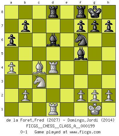 Last move : 0-1 2019 March 2 14:56:26 [Event "FICGS__CHESS__CLASS_A__000199"] [Site "FICGS"] [Date "2018.10.26"] [Round "1"] [White "de la Foret,Fred"] [Black "Domingo,Jordi"] [Result "0-1"] [WhiteElo "2027"] [BlackElo "2014"] 1.d4 d5 2.c4 dxc4 3.Nf3 Nf6 4.e3 e6 5.Bxc4 c5 6.O-O a6 7.a4 Nc6 8.Nc3 Be7 9.Qe2 cxd4 10.Rd1 e5 11.exd4 exd4 12.Nxd4 Nxd4 13.Qe5 Qd6 14.Qxd4 Qxd4 15.Rxd4 O-O 16.Bf4 Bf5 17.Bd6 Rad8 18.Rad1 Bxd6 0-1 QGA : Classical, Rubinstein variation Kingside Castling by player White (move 6) Kingside Castling by player Black (move 15) Player Black won this chess game. Follow this game move after move (download)Your body has to be in top condition. Your Chess deteriorates as your body does. You can't separate body from mind. (Bobby Fischer) Im Schach gewinnt jeder. Hat man Freunde am Spiel - und das ist die Hauptsache - ist auch der Verlust einer Partie kein Unglück. (David Bronstein) Robert Fischer es la ley hacia si mismo. (Larry Evans) Comme les marins qui ont mille raisons différentes d'aller en mer, les joueurs d'échecs en ont tout autant avant de s'installer devant une table et jouer... (Vincent Bertignac, philosophe) The man who strikes first admits that his ideas have given out. (Chinese proverb)