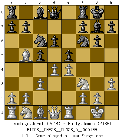 Last move : 1-0 2019 January 15 17:56:3 [Event "FICGS__CHESS__CLASS_A__000199"] [Site "FICGS"] [Date "2018.10.26"] [Round "1"] [White "Domingo,Jordi"] [Black "Romig,James"] [Result "1-0"] [WhiteElo "2014"] [BlackElo "2135"] 1.e4 c5 2.Nf3 d6 3.c3 Nf6 4.Be2 g6 5.O-O Bg7 6.Bb5+ Nc6 7.Re1 O-O 8.h3 e5 9.d4 1-0 Sicilian Kingside Castling by player White (move 5) Kingside Castling by player Black (move 7) Player White won this chess game. Follow this game move after move (download)Human affairs are like a Chess game: only those who do not take it seriously can be called good players. (Hung Tzu Ch'eng) Matt entspricht nicht immer den Tatsachen. (Savielly Grigorievitsch Tartakower) Si tu oponente no puede hacer nada activo, entonces no apures la posición; En vez de eso, dejalo estar sentado ahí, sufriendo y rogandote por un empate. (Jeremy Silman) Les pièces de l'échiquier étaient impitoyables. Elles le retenaient, elles l'absorbaient. Il y avait de l'horreur en cela, mais aussi une harmonie unique. Car, qu'y a-t-il dans le monde, à part les échecs ? (V. Nabokov) I can't decide which is riskier; taking crazy risks, or taking advice on crazy risks from a crazy risk taker. (Gregory House in House M.D.)