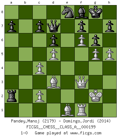 Last move : 1-0 2019 April 26 21:56:40 [Event "FICGS__CHESS__CLASS_A__000199"] [Site "FICGS"] [Date "2018.10.26"] [Round "1"] [White "Pandey,Manoj"] [Black "Domingo,Jordi"] [Result "1-0"] [WhiteElo "2179"] [BlackElo "2014"] 1.e4 e5 2.Nf3 Nc6 3.Nc3 d6 4.d4 exd4 5.Nxd4 Nf6 6.Bb5 Bd7 7.O-O Be7 8.Nxc6 bxc6 9.Bd3 O-O 10.Bd2 Re8 11.f4 Rb8 12.b3 c5 13.Qf3 Bc6 14.Rae1 Bf8 15.Nd5 g6 16.f5 Bxd5 17.exd5 Rxe1 18.Bxe1 Bg7 19.Bh4 Qd7 20.g4 Ne8 21.Kg2 Bh6 22.g5 Bg7 23.Be1 c4 24.bxc4 Rb2 25.f6 Bf8 26.h4 Rxa2 27.h5 1-0 Three knights game Kingside Castling by player White (move 7) Kingside Castling by player Black (move 9) Player White won this chess game. Follow this game move after move (download)In order to improve your game, you must study the endgame before everything else, for whereas the endings can be studied and mastered by themselves, the middle game and the opening must be studied in relation to the endgame. (Jose Raul Capablanca) Über Frauen: Chess is better. (Robert James Fischer) Un entendimiento a fondo de las continuaciones típicas del mate, hace de las combinaciones de sacrificio mas complicadas conducirlas a ellas no solo sin dificultad, sino casi de una manera natural. (Siegbert Tarrasch) Il (Jacob Murray) ne joue pas pour le bon coup, mais pour le meilleur. (Eloi Relange) First of all, we have to go back to the classical time control. (Anatoly Karpov)