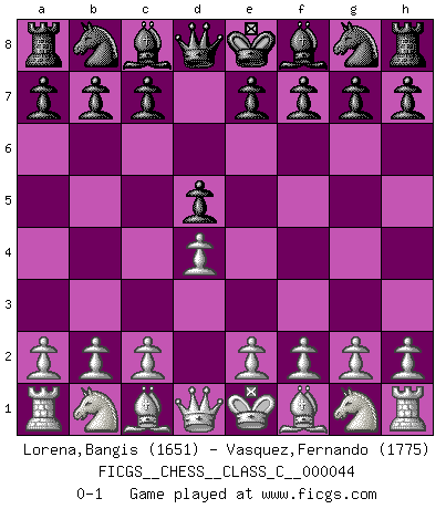 Last move : 0-1 2007 July 2 9:33:11 [Event "FICGS__CHESS__CLASS_C__000044"] [Site "FICGS"] [Date "2007.05.23"] [Round "1"] [White "Lorena,Bangis"] [Black "Vasquez,Fernando"] [Result "0-1"] [WhiteElo "1651"] [BlackElo "1775"] 1.d4 d5 0-1 This chess game has been lost on time (started : 2007.05.23 5:41:21) Queen's pawn game Player Black won this chess game. Follow this game move after move (download)My opponents make good moves too. Sometimes I don't take these things into consideration. (Bobby Fischer) Mit sehr nachdenklichem Gesicht schreitet Bobby durch den Turniersaal. Was ist passiert?, fragt Lombardy. Ich stehe schlecht, antwortet Fischer. Lombardy: Dann biete doch einfach Remis an. Fischer: So schlecht stehe ich nun auch wieder nicht! (Robert James Fischer) Con el tiempo, empecé a progresar en partidas decisivas. Tal vez porque me di cuenta de una simple verdad: no solo estaba yo nervioso sino también mi oponente. (Mikhail Tal) Avec des compensations pour le matériel en plus... (Anonyme) Control your own destiny or someone else will. (Jack Welch)