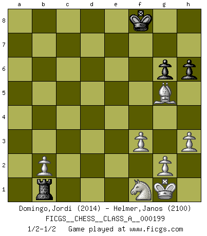 Last move : 1/2-1/2 2019 March 22 21:59:15 [Event "FICGS__CHESS__CLASS_A__000199"] [Site "FICGS"] [Date "2018.10.26"] [Round "1"] [White "Domingo,Jordi"] [Black "Helmer,Janos"] [Result "1/2-1/2"] [WhiteElo "2014"] [BlackElo "2100"] 1.e4 c5 2.Nf3 d6 3.c3 Nf6 4.Be2 g6 5.O-O Bg7 6.Bb5+ Bd7 7.Bxd7+ Nbxd7 8.Re1 O-O 9.d4 Rc8 10.h3 Qb6 11.e5 Nd5 12.dxc5 Qxc5 13.exd6 e6 14.Na3 b5 15.Nd2 Qc6 16.Ne4 h6 17.Nc2 f5 18.Ng3 e5 19.Nb4 Nxb4 20.cxb4 Rf6 21.Qb3+ Kh7 22.Be3 Rxd6 23.Rec1 Qb7 24.Rxc8 Qxc8 25.a4 bxa4 26.Qxa4 a6 27.b5 axb5 28.Qxb5 Qc2 29.Nf1 Qd3 30.Qxd3 Rxd3 31.Ra3 Rd1 32.Ra7 f4 33.Bd2 Nc5 34.Bb4 Ne6 35.f3 Rc1 36.Bd6 Kg8 37.Re7 Ng5 38.Bxe5 Bf8 39.Re8 Kf7 40.Rxf8+ Kxf8 41.Bxf4 Rb1 42.Bxg5 1/2-1/2 Sicilian Kingside Castling by player White (move 5) Kingside Castling by player Black (move 8) This chess game ended in a draw. Follow this game move after move (download)If you aren't afraid of Spassky, then I have removed the element of money. (Jim Slater) Wenn Du einsam bist, wenn Du Dich in der Welt wie ein Fremder fühlst, spiele Schach. Das wird Deinen Geist erheben und Dein Ratgeber im Kampf sein. (Aristoteles) Hoy en día, si tu no eres un Gran Maestro a los 14 años, es mejor que lo olvides. (Anand Viswanathan) On croit qu'il y a plus de mauvais joueurs que de bons joueurs, c'est faux : Il y a autant de joueurs qui gagnent que de joueurs qui perdent. (Philippe Geluck) The right perception of any matter and a misunderstanding of the same matter do not wholly exclude each other. (Kafka's the trial)