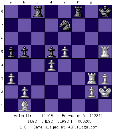 Last move : 1-0 2018 December 21 9:34:47 [Event "FICGS__CHESS__CLASS_F__000208"] [Site "FICGS"] [Date "2018.10.26"] [Round "1"] [White "Valentin,Laurentiu"] [Black "Barradas,Anderson"] [Result "1-0"] [WhiteElo "1109"] [BlackElo "1231"] 1.e4 e5 2.f4 exf4 3.Nf3 d6 4.d4 Bg4 5.Bxf4 Nf6 6.Bd3 Be7 7.O-O Nc6 8.c3 Nh5 9.Be3 a6 10.Nbd2 O-O 11.h3 Bxf3 12.Qxf3 Nf6 13.Rae1 b5 14.Qf5 g6 15.Qf2 Rb8 16.Bg5 Na7 17.Bxf6 Bxf6 18.Qxf6 Qxf6 19.Rxf6 Kg7 20.R6f1 Nc6 21.Nf3 Ne7 22.Nh2 d5 23.e5 Rbc8 24.Ng4 h5 25.Nf6 Rfd8 26.Rf2 c5 27.Ref1 cxd4 28.cxd4 Nc6 29.Nxh5+ gxh5 30.Rxf7+ Kg8 31.R7f4 Nb4 32.Bb1 Kg7 33.Kh2 a5 34.a3 Nc6 35.R1f3 Rf8 36.Rg3+ Kh8 37.Rh4 Ne7 38.Rxh5+ 1-0 KGA : Fischer defense Kingside Castling by player White (move 7) Kingside Castling by player Black (move 10) Player White won this chess game. Follow this game move after move (download)The hardest game to win is a won game. (Emanuel Lasker) Mein Gehirn das ist mein zweitwichtigstes Organ [Aus dem Film: Der Schläfer]. (Woody Allen) Cada Peón es potencialmente una Reina. (James Mason) Aux échecs, l'amour-propre est satisfait quand on remporte la victoire, mais il n'y a pas de honte à être battu. (Benjamin Franklin) If we don't succeed, we run the risk of failure. (George W. Bush)