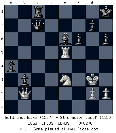 Last move : 0-1 2019 March 3 17:29:11 [Event "FICGS__CHESS__CLASS_F__000208"] [Site "FICGS"] [Date "2018.10.26"] [Round "1"] [White "Goldmund,Heike"] [Black "Strohmeier,Josef"] [Result "0-1"] [WhiteElo "1307"] [BlackElo "1150"] 1.e4 e5 2.Nf3 Nc6 3.Bc4 Bc5 4.c3 a6 5.O-O Nf6 6.d3 O-O 7.Bg5 h6 8.Be3 Bxe3 9.fxe3 d6 10.Nbd2 Na5 11.b4 Nxc4 12.Nxc4 b6 13.d4 exd4 14.exd4 Nxe4 15.Qd3 d5 16.Nce5 Bb7 17.Nd2 Qg5 18.Ndf3 Qe7 19.Rae1 Rac8 20.a4 c5 21.Nd2 cxb4 22.c4 Nxd2 23.Qxd2 dxc4 24.Nxc4 Qc7 25.Ne5 a5 26.Rc1 Qd6 27.Qf4 Qd5 28.Nf3 Bc6 29.Ra1 b3 30.Rab1 Bxa4 31.Rfe1 Rc2 32.Re5 Qd6 33.d5 b5 34.Nd4 Rc4 35.Qe3 Rb4 36.Nf5 Qf6 37.d6 b2 38.Qc3 Rb3 39.Qd4 Rb4 40.Qc3 Rb3 41.Qd4 Kh8 42.d7 b4 43.Rxb2 Rxb2 44.Qxb2 Bxd7 45.Ne3 Qb6 46.Kf1 Be6 47.Re4 Qb5+ 48.Kf2 b3 49.Re5 Qb6 50.Re4 Rc8 51.Kf3 Qb5 52.Re5 Qb7+ 53.Kg3 a4 54.Ra5 Qc7+ 55.Re5 f6 0-1 Giuoco Piano Kingside Castling by player White (move 5) Kingside Castling by player Black (move 6) Player Black won this chess game. Follow this game move after move (download)Chess demands total concentration. (Bobby Fischer) Man braucht nicht immer den besten Zug zu spielen: Ein Zug muß aktiv, unternehmungslustig, korrekt und schön sein. (David Bronstein) Fischer no está bajo la obligación de nadie. (Joseph Platz) Les échecs, c'est la lutte contre l'erreur. (Johannes Zukertort) I don't believe in psychology. I believe in good moves. (Bobby Fischer)