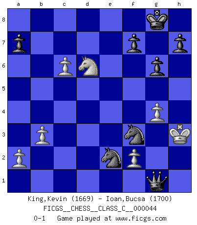 Last move : 0-1 2007 August 19 0:28:2 [Event "FICGS__CHESS__CLASS_C__000044"] [Site "FICGS"] [Date "2007.05.23"] [Round "1"] [White "King,Kevin"] [Black "Ioan,Bucsa"] [Result "0-1"] [WhiteElo "1669"] [BlackElo "1700"] 1.e4 Nf6 2.e5 Nd5 3.d4 d6 4.c4 Nb6 5.exd6 cxd6 6.Nc3 g6 7.Be3 Bg7 8.Rc1 O-O 9.b3 e5 10.dxe5 dxe5 11.Qxd8 Rxd8 12.c5 N6d7 13.Bc4 Nc6 14.Nf3 Na5 15.Bd5 Nf6 16.Bg5 Bf5 17.O-O Nxd5 18.Bxd8 Rxd8 19.Rfd1 Be6 20.Nb5 Nc6 21.Nd6 Nf4 22.Kf1 Bg4 23.Nxb7 Rxd1+ 24.Rxd1 e4 25.h3 exf3 26.hxg4 fxg2+ 27.Kg1 Bc3 28.Nd6 Ne5 29.Kh2 Be1 30.Rxe1 Nf3+ 31.Kg3 Nxe1 32.c6 Ne2+ 33.Kh4 Nf3+ 34.Kh3 g1Q 0-1 Alekhine's defense : Exchange variation Kingside Castling by player Black (move 8) Kingside Castling by player White (move 17) Promotion Queen by player Black (move 34) Player Black won this chess game. Follow this game move after move (download)Mistrust is the most necessary characteristic of the Chess player. (Siegbert Tarrasch) Irgendwie scheint mir sonntags früh um 9 Uhr der Killerinstinkt verloren gegangen zu sein. (Alexej Shirov) Un Peón pasado aumenta su poder a medida de que el número de piezas en el tablero disminuye. (Capablanca) Le jeu d'échecs est comme rejeté hors du temps. (Antoine de Saint-Exupéry) Opportunities multiply as they are seized. (Sun Tzu)