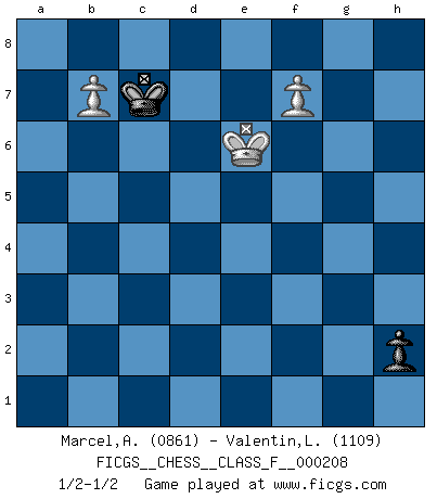 Last move : 1/2-1/2 2018 December 3 11:30:26 [Event "FICGS__CHESS__CLASS_F__000208"] [Site "FICGS"] [Date "2018.10.26"] [Round "1"] [White "Marcel,Alexis"] [Black "Valentin,Laurentiu"] [Result "1/2-1/2"] [WhiteElo "0861"] [BlackElo "1109"] 1.f4 d5 2.Nf3 Nf6 3.b3 e6 4.Bb2 Be7 5.e3 O-O 6.Be2 c5 7.O-O Nc6 8.a3 b6 9.Qe1 Bb7 10.h3 Ne4 11.Nc3 Nf6 12.g4 d4 13.exd4 cxd4 14.Nb5 Qd5 15.Nbxd4 Rad8 16.c4 Qd7 17.Nxc6 Qxc6 18.Rd1 Ne4 19.d3 Nc5 20.b4 Nd7 21.Qf2 Bf6 22.Bxf6 Nxf6 23.Qh2 Qa4 24.Ra1 Qc6 25.Ne5 Qd6 26.Rad1 Qd4+ 27.Qf2 Qxf2+ 28.Kxf2 Nd7 29.Nxd7 Rxd7 30.Bf3 Bxf3 31.Kxf3 Rfd8 32.Ke3 Kf8 33.Rd2 Ke7 34.Rfd1 Kf6 35.d4 Ke7 36.c5 bxc5 37.dxc5 Rxd2 38.Rxd2 Ra8 39.Ke4 a5 40.Rd4 axb4 41.axb4 Ra3 42.b5 Rxh3 43.Rd6 Rh1 44.Kd4 Rd1+ 45.Ke5 Rxd6 46.cxd6+ Kd7 47.g5 h6 48.b6 Kc6 49.gxh6 gxh6 50.Kf6 Kxd6 51.Kxf7 h5 52.b7 Kc7 53.Kxe6 h4 54.f5 h3 55.f6 h2 56.f7 1/2-1/2 Bird's Opening Kingside Castling by player Black (move 5) Kingside Castling by player White (move 7) 10 pieces endgame at move 46 : White KPPPP , Black KPPPP WHITE : King + 4 Pawns BLACK : King + 4 Pawns 9 pieces endgame at move 49 : White KPPPP , Black KPPP WHITE : King + 4 Pawns BLACK : King + 3 Pawns 8 pieces endgame at move 49 : White KPPP , Black KPPP WHITE : King + 3 Pawns BLACK : King + 3 Pawns 7 pieces endgame at move 50 : White KPP , Black KPPP WHITE : King + 2 Pawns BLACK : King + 3 Pawns 6 pieces endgame at move 51 : White KPP , Black KPP WHITE : King + 2 Pawns BLACK : King + 2 Pawns 5 pieces endgame at move 53 : White KPP , Black KP WHITE : King + 2 Pawns BLACK : King + 1 Pawn This chess game ended in a draw. Follow this game move after move (download)No Chess Grandmaster is normal; they only differ in the extent of their madness. (Viktor Korchnoi) Dieses schreckliche Gefühl, dass ich gegen eine Maschine spielte, die niemals Fehler macht, zerschmetterte meinen Widerstand. (Mark Taimanov) El jugador blanco perdió porque fallo en recordar la coreccta continuación y tuvo que pensar por sí mismo las movidas. (Siegbert Tarrasch) La vérité est comme le meilleur coup aux échecs : elle existe, mais il faut la chercher. (Arturo Perez-Reverte) Nothing is more important for teaching us to understand the concepts we have than constructing fictitious ones. (Ludwig Wittgenstein)