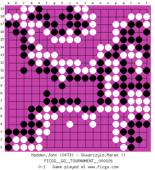 Last move : 0-1 2018 December 17 8:46:22 [Event "FICGS__GO__TOURNAMENT__000026"] [Site "FICGS"] [Date "2018.10.26"] [Round "1"] [Black "Hadden,John"] [White "Skwarczylo,Marek"] [Result "0-1"] [Rating 1 "0473"] 1.c4 d16 2.r4 p16 3.q16 q17 4.q15 p17 5.r17 p15 6.c16 c17 7.c15 d17 8.p13 r18 9.s17 p3 10.q3 e3 11.d3 f3 12.e4 f4 13.f8 p4 14.q9 e5 15.d4 g5 16.d6 e14 17.d12 o6 18.p6 m4 19.o7 j4 20.k16 d15 21.c14 m17 22.l17 m16 23.f17 f16 24.g17 e12 25.e11 d13 26.c13 s18 27.r16 h15 28.h16 k15 29.f12 e13 30.c11 n6 31.k7 p7 32.q7 p8 33.n8 q6 34.q8 r5 35.s5 s6 36.s4 p5 37.p9 m12 38.n12 m11 39.n11 l18 40.k18 l16 41.k17 m18 42.e18 k12 43.k10 h11 44.g11 h10 45.g10 g15 46.d18 s8 47.s9 g12 48.h9 g13 49.g6 q2 50.r2 q1 51.r1 p2 52.t8 t7 53.t9 q4 54.r3 s7 55.s2 n13 56.o13 o8 57.n7 o9 58.n9 o10 59.m10 p11 60.q11 o12 61.n10 p10 62.q10 p12 63.q12 q13 64.q14 r13 65.p14 s13 66.s14 r14 67.s15 s11 68.s10 s12 69.t11 n14 70.r11 e2 71.d2 j6 72.j7 k6 73.l6 l5 74.m6 c18 75.b17 h6 76.g7 k19 77.j19 l19 78.j18 b18 79.b16 l11 80.l10 d1 81.c1 e1 82.d5 c2 83.c3 b2 84.b3 m5 85.a2 b1 86.e6 t17 87.t16 t18 88.t14 f13 89.f11 o14 90.r15 f5 91.j11 h12 92.j10 e17 93.f18 j16 94.j17 j15 95.g16 j12 96.h7 d19 97.h18 a18 98.e19 c19 99.a17 f6 100.f7 r8 101.r9 r6 102.t13 t5 103.t4 t6 104.a3 c1 105.o11 p6 106.pass pass 107.d14 k11 108.a1 r7 109.pass pass 0-1 Here are the names of the openings (joseki) played in the four corners : Corner q16 : p16 q16 Takamoku (Gomok, Gaomu`) 5-4 Point. The takamoku (high) point (5-4). With its emphasis on influence, the 5-4 point complements the 4-4 (hoshi) point in creating an influence-oriented fuseki. Corner d16 : d16 c16 Hoshi (Hwajeom, Seongjeom, Xingwei`) 4-4 Point. The star or hoshi (4-4) point, emphasizing influence at the potential expense of territory. Corner q4 : r4 p3 Komoku (Somok, Xiao~mu`) 3-4 Point. The komoku (3-4) point is the traditional corner enclosure move.. Ikken Kakari (Hankan Keolch'im, Yi Gua`jiao~, 1-Space Low Pincer). The small knight move is the basic approach move to the 3-4 point stone. It has been continually used for over four centuries. There are limitless variations, with new moves constantly being discovered. White 2 opens the door to a treaure store of joseki. Corner d4 : c4 e3 Komoku (Somok, Xiao~mu`) 3-4 Point. The komoku (3-4) point is the traditional corner enclosure move.. Ikken Kakari (Hankan Keolch'im, Yi Gua`jiao~, 1-Space Low Pincer). The small knight move is the basic approach move to the 3-4 point stone. It has been continually used for over four centuries. There are limitless variations, with new moves constantly being discovered. White 2 opens the door to a treaure store of joseki. Player White won this Go (weiqi, baduk) game. Follow this game move after move (download)Every move brings change. (Pierre Audouard) Empty your mind, be formless, shapeless — like water. (Bruce Lee)