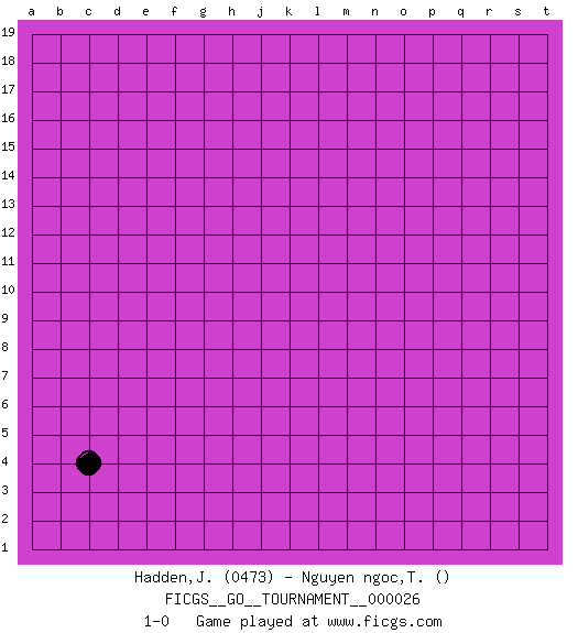 Last move : 1-0 2018 November 25 23:38:52 [Event "FICGS__GO__TOURNAMENT__000026"] [Site "FICGS"] [Date "2018.10.26"] [Round "1"] [Black "Hadden,John"] [White "Nguyen ngoc,Thuy Duong"] [Result "1-0"] [Rating 1 "0473"] 1.c4 1-0 This go game has been lost on time (started : 2018.10.26 16:19:28) Here are the names of the openings (joseki) played in the four corners : Corner d4 : c4 1-0 Komoku (Somok, Xiao~mu`) 3-4 Point. The komoku (3-4) point is the traditional corner enclosure move.. Player Black won this Go (weiqi, baduk) game. Follow this game move after move (download)You have to like to win, and to learn to recognize the errors that gave you the victory. (Pierre Audouard) That's absurd. I love it. (Gregory House, House M.D.)