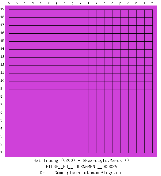 Last move : 0-1 2018 November 25 23:38:52 [Event "FICGS__GO__TOURNAMENT__000026"] [Site "FICGS"] [Date "2018.10.26"] [Round "1"] [Black "Hai,Truong"] [White "Skwarczylo,Marek"] [Result "0-1"] [Rating 1 "0200"] 0-1 This go game has been lost on time (started : 2018.10.26 16:19:28) Here are the names of the openings (joseki) played in the four corners : Player White won this Go (weiqi, baduk) game. Follow this game move after move (download)There are players who don't accept exchange: they play many moves that perpetuate a previous state of the game. (Pierre Audouard) What doesn't kill us makes us stronger. (Friedrich Nietzsche)
