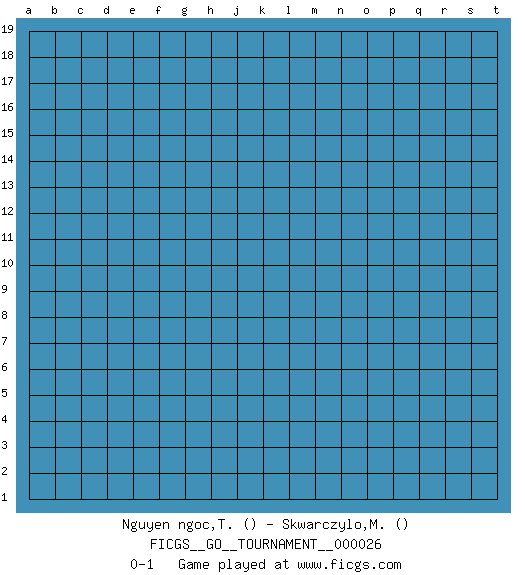 Last move : 0-1 2018 November 25 23:38:52 [Event "FICGS__GO__TOURNAMENT__000026"] [Site "FICGS"] [Date "2018.10.26"] [Round "1"] [Black "Nguyen ngoc,Thuy Duong"] [White "Skwarczylo,Marek"] [Result "0-1"] 0-1 This go game has been lost on time (started : 2018.10.26 16:19:28) Here are the names of the openings (joseki) played in the four corners : Player White won this Go (weiqi, baduk) game. Follow this game move after move (download)Each step in a ladder is worth 7 points. (Anonymous) Dave, my mind is going. I can feel it. (HAL 9000 in 2001, a space odyssey)