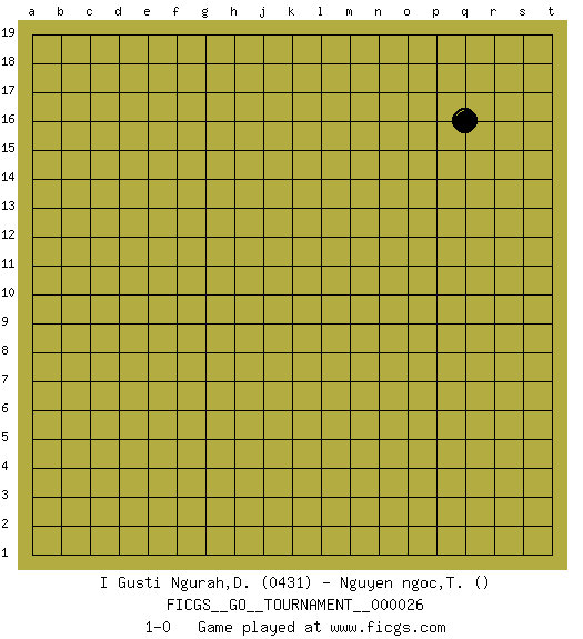 Last move : 1-0 2018 November 26 11:38:50 [Event "FICGS__GO__TOURNAMENT__000026"] [Site "FICGS"] [Date "2018.10.26"] [Round "1"] [Black "I Gusti Ngurah,Divayana"] [White "Nguyen ngoc,Thuy Duong"] [Result "1-0"] [Rating 1 "0431"] 1.q16 1-0 This go game has been lost on time (started : 2018.10.26 16:19:28) Here are the names of the openings (joseki) played in the four corners : Player Black won this Go (weiqi, baduk) game. Follow this game move after move (download)Don't overlook the edge of the board. (Anonymous) The problem with manipulation is that people can turn on you. (Horatio Caine, C.S.I. Miami)