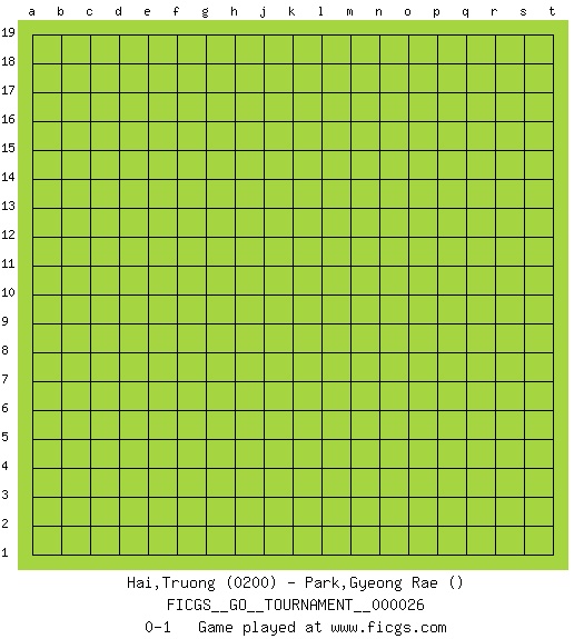 Last move : 0-1 2018 November 25 23:38:52 [Event "FICGS__GO__TOURNAMENT__000026"] [Site "FICGS"] [Date "2018.10.26"] [Round "1"] [Black "Hai,Truong"] [White "Park,Gyeong Rae"] [Result "0-1"] [Rating 1 "0200"] 0-1 This go game has been lost on time (started : 2018.10.26 16:19:28) Here are the names of the openings (joseki) played in the four corners : Player White won this Go (weiqi, baduk) game. Follow this game move after move (download)Don't defend - extend ! (Bill Taylor) If you work for a living, why do you kill yourself working ? (Tuco to a chicken in The Good, The Bad and The Ugly)