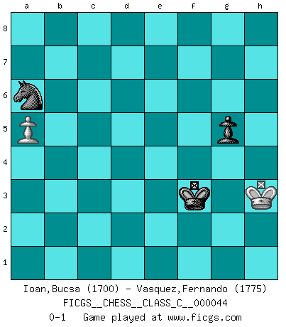 Last move : 0-1 2007 December 9 10:7:31 [Event "FICGS__CHESS__CLASS_C__000044"] [Site "FICGS"] [Date "2007.05.23"] [Round "1"] [White "Ioan,Bucsa"] [Black "Vasquez,Fernando"] [Result "0-1"] [WhiteElo "1700"] [BlackElo "1775"] 1.e4 e5 2.Nf3 Nf6 3.Nxe5 d6 4.Nf3 Nxe4 5.d4 d5 6.Bd3 Nc6 7.O-O Be7 8.c4 Nb4 9.Be2 O-O 10.Nc3 Be6 11.Ne5 f6 12.Nf3 Re8 13.Re1 Bf7 14.Be3 Qd7 15.a3 Nxc3 16.bxc3 Nc6 17.cxd5 Bxd5 18.c4 Be4 19.d5 Na5 20.Nd2 Bg6 21.Nb3 Qa4 22.Nd4 Qxd1 23.Raxd1 b6 24.Nb5 Bd6 25.h4 Nb3 26.Bd3 Bxd3 27.Rxd3 Nc5 28.R3d1 Nd7 29.Rd4 Kf7 30.h5 Nc5 31.Kf1 Re7 32.Rd2 Nb7 33.Rc2 Re5 34.g4 Rae8 35.Ke2 f5 36.gxf5 Rxf5 37.h6 g6 38.Nxa7 Rh5 39.Nb5 Rxh6 40.R2c1 Rh4 41.Rh1 Rxh1 42.Rxh1 h5 43.Kd3 Nc5+ 44.Kc2 Ne4 45.Bd4 Be5 46.Bxe5 Rxe5 47.f3 Nc5 48.Kd2 Re7 49.Nc3 Kg7 50.Nb5 Kf6 51.Nd4 Rh7 52.Ke2 g5 53.Rd1 Rf7 54.Nc6 Kg7 55.d6 Rd7 56.dxc7 Rxc7 57.Nb4 Ne6 58.Kf2 Rxc4 59.Rd7+ Kf8 60.Rb7 Nf4 61.Rb8+ Kf7 62.Rb7+ Ke8 63.Rxb6 h4 64.Rc6 Rd4 65.Rc2 Rd1 66.Rb2 Ra1 67.Ra2 Rb1 68.Nc6 Rh1 69.Nb4 Kd8 70.Rc2 Ke7 71.a4 Ra1 72.Na2 Nd3+ 73.Ke2 Rxa2 74.Rxa2 Nc1+ 75.Kf2 Nxa2 76.Kg2 Kf6 77.Kf1 Ke5 78.a5 Nb4 79.Kf2 Kf4 80.Kg2 h3+ 81.Kh2 Kxf3 82.Kxh3 Na6 0-1 Petrov : Classical attack Kingside Castling by player White (move 7) Kingside Castling by player Black (move 9) 10 pieces endgame at move 63 : White KRNPP , Black KRNPP WHITE : King + 1 Rook 1 Knight 2 Pawns BLACK : King + 1 Rook 1 Knight 2 Pawns 9 pieces endgame at move 73 : White KRPP , Black KRNPP WHITE : King + 1 Rook 2 Pawns BLACK : King + 1 Rook 1 Knight 2 Pawns 8 pieces endgame at move 74 : White KRPP , Black KNPP WHITE : King + 1 Rook 2 Pawns BLACK : King + 1 Knight 2 Pawns 7 pieces endgame at move 75 : White KPP , Black KNPP WHITE : King + 2 Pawns BLACK : King + 1 Knight 2 Pawns 6 pieces endgame at move 81 : White KP , Black KNPP WHITE : King + 1 Pawn BLACK : King + 1 Knight 2 Pawns 5 pieces endgame at move 82 : White KP , Black KNP WHITE : King + 1 Pawn BLACK : King + 1 Knight 1 Pawn Player Black won this chess game. Follow this game move after move (download)Many have become Chess Masters, no one has become the Master of Chess. (Siegbert Tarrasch) Ohne Leiden bildet sich kein Charakter. (Ernst Freiherr von Feuchtersleben) A la fecha, Fischer esta simplemente un nivel arriba de todos los mejores jugadores de Ajedrez del mundo. (John Jacobs) Des points faibles ou des trous dans la position de l'adversaire doivent être occupés par des pièces et non pas par des pions. (Siegbert Tarrasch) They say in chess you've got to kill the queen, and then you mate it... Oh I, do you ? (Red Hot Chili Peppers, Fortune faded)