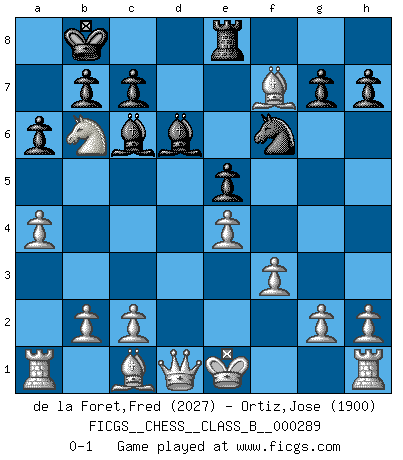 Last move : 0-1 2019 March 12 13:24:59 [Event "FICGS__CHESS__CLASS_B__000289"] [Site "FICGS"] [Date "2018.10.26"] [Round "1"] [White "de la Foret,Fred"] [Black "Ortiz,Jose"] [Result "0-1"] [WhiteElo "2027"] [BlackElo "1900"] 1.e4 e5 2.Nf3 d6 3.d4 Nc6 4.Bc4 Nf6 5.Nc3 a6 6.Ng5 Be6 7.d5 Bg4 8.f3 Bd7 9.dxc6 Bxc6 10.Nxf7 Qd7 11.Nxh8 O-O-O 12.Nf7 Re8 13.a4 d5 14.Nxd5 Qxf7 15.Nb6+ Kb8 16.Bxf7 Bd6 0-1 Philidor's defense Queenside Castling by player Black (move 11) Player Black won this chess game. Follow this game move after move (download)You cannot play at Chess if you are kind-hearted. (French Proverb) Ich glaube nicht an Psychologie, ich glaube an gute Züge. (Robert James Fischer) No existe un remordimiento como el remordimiento del Ajedrez. (H. G. Wells) Des idées, des idées, j'en ai cent, j'en ai mille. Des bonnes, des mauvaises, applicables, irréalisables... Il suffit de faire le tri ! (Roos) Creativity is allowing yourself to make mistakes. Art is knowing which ones to keep. (Scott Adams)