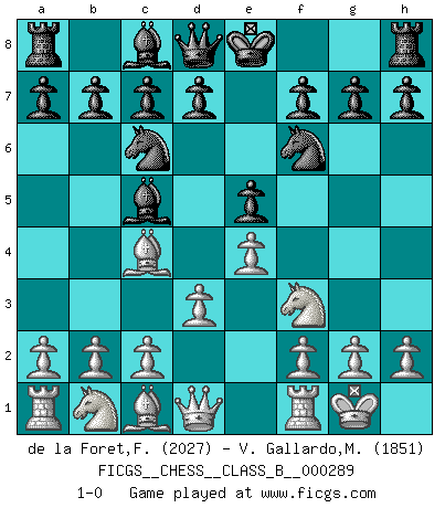 Last move : 1-0 2018 December 9 12:55:57 [Event "FICGS__CHESS__CLASS_B__000289"] [Site "FICGS"] [Date "2018.10.26"] [Round "1"] [White "de la Foret,Fred"] [Black "V. Gallardo,Miguel"] [Result "1-0"] [WhiteElo "2027"] [BlackElo "1851"] 1.e4 e5 2.Nf3 Nc6 3.Bc4 Bc5 4.O-O Nf6 5.d3 1-0 This chess game has been lost on time (started : 2018.10.26 20:22:15) Giuoco Piano Kingside Castling by player White (move 4) Player White won this chess game. Follow this game move after move (download)Best by test: 1. e4 (Bobby Fischer) Schach ist wie eine schöne Frau, zu der wir ständig zurückkehren, gleichviel, wie oft sie uns zurückweist. (Anonymous) Es muy difícil jugar en contra de la teoría de Einstein. - en su primera derrota en contra de Fischer (Mikhail Tal) 'L'échange des dames est un coup dur pour les deux adversaires...' Un journaliste lors d'une partie du match Spassky-Fischer I would love to change the world, but they won't give me the source code. (Unknown)