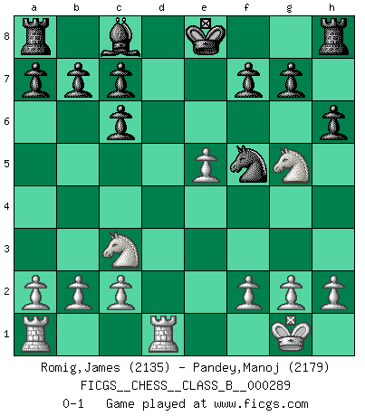 Last move : 0-1 2019 January 16 18:1:33 [Event "FICGS__CHESS__CLASS_B__000289"] [Site "FICGS"] [Date "2018.10.26"] [Round "1"] [White "Romig,James"] [Black "Pandey,Manoj"] [Result "0-1"] [WhiteElo "2135"] [BlackElo "2179"] 1.e4 e5 2.Nf3 Nc6 3.Bb5 Nf6 4.O-O Nxe4 5.d4 Nd6 6.Bxc6 dxc6 7.dxe5 Nf5 8.Qxd8+ Kxd8 9.Nc3 Be7 10.Rd1+ Ke8 11.Bg5 Bxg5 12.Nxg5 h6 0-1 Ruy Lopez : Berlin defense, Open variation Kingside Castling by player White (move 4) Player Black won this chess game. Follow this game move after move (download)Via the squares on the chessboard, the Indians explain the movement of time and the age, the higher influences which control the world and the ties which link Chess with the human soul. (Al-Masudi) Moralische Siege zählen nicht. (Savielly Grigorievitsch Tartakower) El ganador de una partida es aquel jugador que hace el penúltimo error. (Savielly Tartakover) Le génie consiste à savoir transgresser les règles au moment opportun. (Teichmann) There's no money in correspondence chess. (John Knudsen)