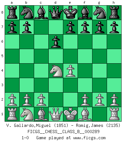 Last move : 1-0 2019 January 21 6:40:46 [Event "FICGS__CHESS__CLASS_B__000289"] [Site "FICGS"] [Date "2018.10.26"] [Round "1"] [White "V. Gallardo,Miguel"] [Black "Romig,James"] [Result "1-0"] [WhiteElo "1851"] [BlackElo "2135"] 1.e4 c5 2.Nf3 d6 3.d4 cxd4 4.Nxd4 1-0 Sicilian Player White won this chess game. Follow this game move after move (download)Discovered check is the dive bomber of the Chessboard. (Reuben Fine) Ich habe die besten Aussichten, den ersten Preis zu gewinnen - denn jeder muss gegen Steinitz spielen, nur ich nicht! (Wilhelm Steinitz) Yo creo que el Ajedrez posee una magia que es también una ayuda en la edad avanzada. Una rodilla reumática es olvidada durante una partida de Ajedrez y otros eventos pueden parecer algo sin importancia comparada a una catástrofe en el tablero de Ajedrez. (Vlastimil Hort) Toutes choses étant égales, c'est la conviction qui gagne. Alliée à une volonté de vaincre, elle sert de détonateur, suscite des idées, disperse les doutes et aide à penser clairement. (Robert Fischer) The Internet is so big, so powerful and pointless that for some people it is a complete substitute for life. (Andrew Brown)