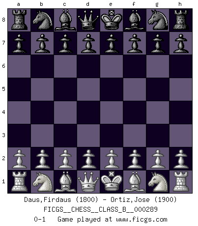 Last move : 0-1 2018 December 6 0:32:46 [Event "FICGS__CHESS__CLASS_B__000289"] [Site "FICGS"] [Date "2018.10.26"] [Round "1"] [White "Daus,Firdaus"] [Black "Ortiz,Jose"] [Result "0-1"] [WhiteElo "1800"] [BlackElo "1900"] 0-1 This chess game has been lost on time (started : 2018.10.26 20:22:15) Player Black won this chess game. Follow this game move after move (download)In order to improve your game, you must study the endgame before everything else, for whereas the endings can be studied and mastered by themselves, the middle game and the opening must be studied in relation to the endgame. (Jose Raul Capablanca) Ohne Fehler kann es keine Brillanz geben. (Emanuel Lasker) El muchacho (en ese entonces un niño de 12 años llamado Anatoly Karpov) no tiene ni idea de lo que es el Ajedrez y no hay futuro en absoluto para el en esta profesión. (Mikhail Botvinnik) Il n'y a plus de joueurs du niveau de Jacob Murray dont la seule quête est le beau jeu, le plaisir de voir les pièces construire quelque chose. Sur 10 idées à la minute, 9 seront sans intérêt, la dernière s'avèrera géniale. (Christian Bauer) There are more things in heaven and earth than practically anywhere else. (Unknown)