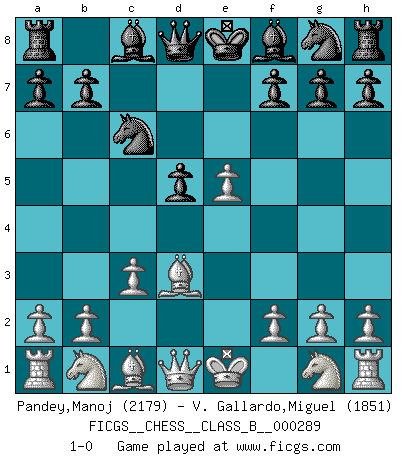 Last move : 1-0 2018 December 9 0:55:54 [Event "FICGS__CHESS__CLASS_B__000289"] [Site "FICGS"] [Date "2018.10.26"] [Round "1"] [White "Pandey,Manoj"] [Black "V. Gallardo,Miguel"] [Result "1-0"] [WhiteElo "2179"] [BlackElo "1851"] 1.e4 c6 2.d4 d5 3.exd5 cxd5 4.Bd3 Nc6 5.c3 e5 6.dxe5 1-0 This chess game has been lost on time (started : 2018.10.26 20:22:15) Caro-Kann : Exchange variation Player White won this chess game. Follow this game move after move (download)Of all my Russian books, the defense contains and diffuses the greatest 'warmth' which may seem odd seeing how supremely abstract Chess is supposed to be. (Vladimir Nabokov) Schach ist Kampf, hauptsächlich jedoch gegen die eigenen Fehler. (Savielly Grigorievitsch Tartakower) El jugador táctico sabe que hacer cuando hay algo que hacer; mientras que el estratega sabe que hacer cuando no hay nada que hacer. (Gerald Abrahams) Plusieurs personnes se sont demandées comment Tal faisait pour gagner... En fait, c'est très simple ! Il met ses pièces au centre de l'échiquier et les sacrifie quelque part ! (David Bronstein) Optimism is a variety of information deficit. Sometimes especially true for correspondence chess games. (Michael Aigner)