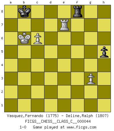 Last move : 1-0 2007 August 22 0:37:56 [Event "FICGS__CHESS__CLASS_C__000044"] [Site "FICGS"] [Date "2007.05.23"] [Round "1"] [White "Vasquez,Fernando"] [Black "Deline,Ralph"] [Result "1-0"] [WhiteElo "1775"] [BlackElo "1807"] 1.e4 e5 2.Nf3 Nc6 3.d4 exd4 4.Nxd4 Nf6 5.Nxc6 bxc6 6.e5 Qe7 7.Qe2 Nd5 8.c4 Nb6 9.Nc3 g6 10.Ne4 Bg7 11.Bg5 Qb4+ 12.Qd2 Qxd2+ 13.Kxd2 O-O 14.Nf6+ Bxf6 15.Bxf6 Re8 16.Bd3 d6 17.exd6 cxd6 18.Rhe1 Be6 19.b3 d5 20.c5 Nd7 21.Bd4 Nf8 22.Kc3 Bd7 23.Rxe8 Rxe8 24.b4 Ne6 25.a4 Nf4 26.Bf1 Ne2+ 27.Bxe2 Rxe2 28.b5 cxb5 29.axb5 Bxb5 30.Rxa7 Kf8 31.Be3 h5 32.Kd4 Re1 33.g3 Ke8 34.Ke5 d4 35.Kd6 f6 36.Bxd4 Rd1 37.Kd5 Bf1 38.Ra3 Bg2+ 39.f3 Kd8 40.c6 Kc7 41.h4 Bh1 42.Ra7+ Kc8 43.Kc5 Bxf3 44.Be3 Kb8 45.Ra3 g5 46.hxg5 fxg5 47.Bxg5 Rd5+ 48.Kb6 Rxg5 49.Rxf3 Rg8 50.Re3 Rf8 51.Re7 1-0 Scotch : Mieses variation Kingside Castling by player Black (move 13) 10 pieces endgame at move 46 : White KRBPP , Black KRBPP WHITE : King + 1 Rook 1 Bishop 2 Pawns BLACK : King + 1 Rook 1 Bishop 2 Pawns 9 pieces endgame at move 47 : White KRBPP , Black KRBP WHITE : King + 1 Rook 1 Bishop 2 Pawns BLACK : King + 1 Rook 1 Bishop 1 Pawn 8 pieces endgame at move 48 : White KRPP , Black KRBP WHITE : King + 1 Rook 2 Pawns BLACK : King + 1 Rook 1 Bishop 1 Pawn 7 pieces endgame at move 49 : White KRPP , Black KRP WHITE : King + 1 Rook 2 Pawns BLACK : King + 1 Rook 1 Pawn Player White won this chess game. Follow this game move after move (download)Chess demands total concentration. (Bobby Fischer) Schach ist eine Sache der genauen Beurteilung, wann man zuschlagen und wann man sich ducken muss. (Robert James Fischer) El jugador de combinación piensa hacia adelante; comienza de la posición dada y trabaja las movidas contundentes en su mente. (Emanuel Lasker) Karpov est une pièce de musée. (Garry Kasparov) It is the aim of the modern school, not to treat every position according to one general law, but according to the principle inherent in the position. (Richard Reti)