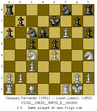 Last move : 1-0 2018 December 4 12:48:49 [Event "FICGS__CHESS__RAPID_B__000300"] [Site "FICGS"] [Date "2018.10.28"] [Round "1"] [White "Vasquez,Fernando"] [Black "Liwat,Lowell"] [Result "1-0"] [WhiteElo "1951"] [BlackElo "1852"] 1.e4 c5 2.c3 e5 3.Nf3 Nc6 4.Bc4 d6 5.d4 h6 6.dxe5 dxe5 7.Qxd8+ Kxd8 8.Bxf7 Nf6 9.O-O Bd6 10.Na3 a6 11.Nc4 Ke7 12.Bd5 Nd7 13.Nh4 Nf8 14.f4 Be6 15.Bxe6 Kxe6 16.f5+ Ke7 17.f6+ 1-0 Sicilian : Alapin's variation (2.c3) Kingside Castling by player White (move 9) Player White won this chess game. Follow this game move after move (download)It began to feel as though you were playing against Chess itself. - On playing against Robert Fischer. (Walter Shipman) Um sich vor der Gefahr einer Erkältung zu schützen, sorge der wanderlustige König beizeiten für ein brauchbares Versteck. (Aaron Nimzowitsch) El ganador de una partida es aquel jugador que hace el penúltimo error. (Savielly Tartakover) La solitude du joueur d'Echecs à l'approche du mat est semblable à celle du condamné. (Francis Szpiner) Philosophers use a language that is already deformed as though by shoes that are too tight. (Ludwig Wittgenstein)