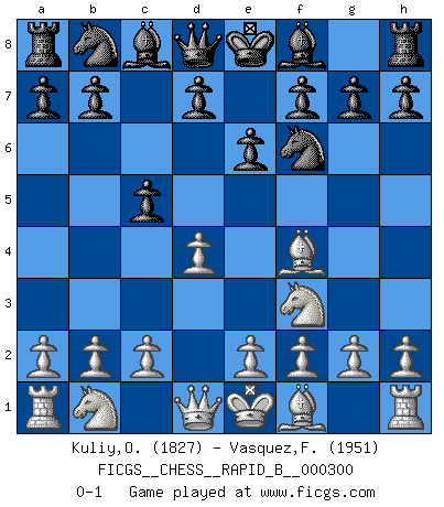 Last move : 0-1 2018 December 2 12:9:23 [Event "FICGS__CHESS__RAPID_B__000300"] [Site "FICGS"] [Date "2018.10.28"] [Round "1"] [White "Kuliy,Oleksandr"] [Black "Vasquez,Fernando"] [Result "0-1"] [WhiteElo "1827"] [BlackElo "1951"] 1.d4 Nf6 2.Nf3 e6 3.Bf4 c5 0-1 This chess game has been lost on time (started : 2018.10.28 11:17:38) Queen's pawn game Player Black won this chess game. Follow this game move after move (download)Chess is as much a mystery as women. (Purdy) Kein Großmeister ist normal. Sie unterscheiden sich nur im Ausmaß Ihrer Verrücktheit. (Viktor Kortschnoi) No volvere nunca a jugar contigo. Has insultado a mi amigo. - cuando un oponente se maldijo por una mala jugada (Miguel Najdorf) Toute estimation doit être constamment réévaluée. (Jacob Estrin) Without enthusiasm, virtue functions not at all, and vice only poorly. (Mignon McLaughlin, The Neurotic's Notebook, 1960)