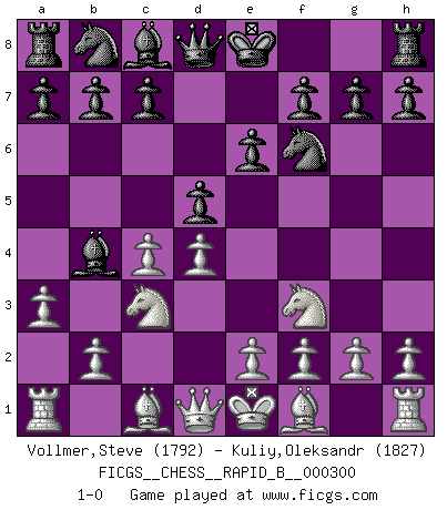 Last move : 1-0 2018 December 2 0:2:49 [Event "FICGS__CHESS__RAPID_B__000300"] [Site "FICGS"] [Date "2018.10.28"] [Round "1"] [White "Vollmer,Steve"] [Black "Kuliy,Oleksandr"] [Result "1-0"] [WhiteElo "1792"] [BlackElo "1827"] 1.d4 d5 2.c4 e6 3.Nc3 Nf6 4.Nf3 Bb4 5.a3 1-0 This chess game has been lost on time (started : 2018.10.28 11:17:38) QGD : Ragozin variation Player White won this chess game. Follow this game move after move (download)Even the laziest King flees wildly in the face of a double check ! (Aaron Nimzowitsch) Strategie ist, wie man ein Mädchen auf den Rücksitz bekommt. Taktik ist, was man tut, wenn man dann dort ist. (Anonymous) Cuando la partida de Ajedrez termina, el Peón y el Rey regresan a la misma caja. (Irish saying) Les Echecs ne sont pas pour les âmes timides. Ils requièrent un homme entier, qui ne s'arrête pas aveuglément à ce qui a été déjà établi, mais qui tente individuellement de sonder les profondeurs du jeu. (W. Steinitz) Those who make the worst use of their time are the first to complain of its brevity. (Jean de la Bruyere)