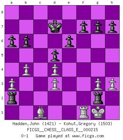 Last move : 0-1 2019 January 29 10:9:55 [Event "FICGS__CHESS__CLASS_E__000215"] [Site "FICGS"] [Date "2018.10.28"] [Round "1"] [White "Hadden,John"] [Black "Kohut,Gregory"] [Result "0-1"] [WhiteElo "1421"] [BlackElo "1503"] 1.d4 Nf6 2.Nc3 d5 3.Nf3 Bf5 4.e3 e6 5.Bd2 c5 6.Bd3 Bxd3 7.cxd3 cxd4 8.Nxd4 Nc6 9.O-O Nxd4 10.exd4 Bd6 11.Qa4+ Qd7 12.Qxd7+ Kxd7 13.a3 Rac8 14.b4 Ng8 15.Rac1 Ne7 16.Nb5 Bb8 17.Rc5 Nc6 18.h3 a6 19.Nc3 b6 20.Rxc6 Rxc6 21.Rd1 Rhc8 22.Ne2 Rc2 23.Ng3 Bxg3 24.fxg3 Ra2 25.Bc1 R8c2 26.Rf1 Rxg2+ 0-1 Queen's pawn game Kingside Castling by player White (move 9) Player Black won this chess game. Follow this game move after move (download)A chess genius has died; a loss for humanity. (Viktor Kortchnoi, about Bobby Fischer's death) Meine Liebe ist Schach, Schach, Schach. Ich muss jeden Tag Schach spielen, deshalb fühle ich mich so stark. (Miguel Najdorf) No hay un Gran Maestro de Ajedrez que sea normal; solo se diferencían ellos por la magnitud de su locura. (Viktor Korchnoi) La guerre est enfant de la passion, la passion est enfant du narcissisme et le narcissisme est l'enfant. (...) Une autre partie ? (Thibault de Vassal) It's unlucky to be superstitious. (Dave Enteles)