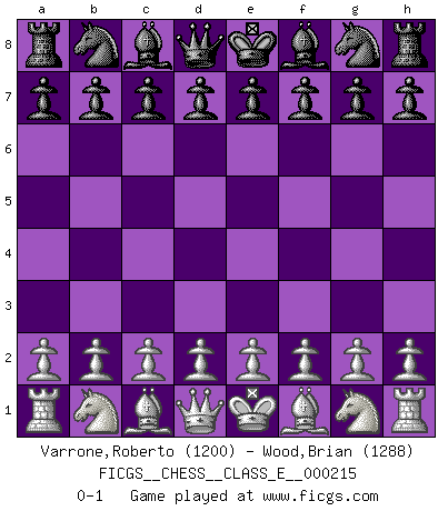 Last move : 0-1 2018 December 8 0:45:7 [Event "FICGS__CHESS__CLASS_E__000215"] [Site "FICGS"] [Date "2018.10.28"] [Round "1"] [White "Varrone,Roberto"] [Black "Wood,Brian"] [Result "0-1"] [WhiteElo "1200"] [BlackElo "1288"] 0-1 This chess game has been lost on time (started : 2018.10.28 19:13:57) Player Black won this chess game. Follow this game move after move (download)At this time Fischer is simply a level above all the best Chessplayers in the world. (John Jacobs) Kasparov ist eine Art Monster mit hundert Augen, denen auch nicht das Geringste entgeht. (Tony Miles) Una de estas pequeñas movidas modestas pudieran ser mas molestas a tu oponente que la amenaza mas grande. (Siegbert Tarrasch) L'ordinateur a tué l'originalité. Il n'y a plus guère d'aventures sur l'échiquier. (Jacob Murray) When you stop learning you start dying. (Scott Adams)