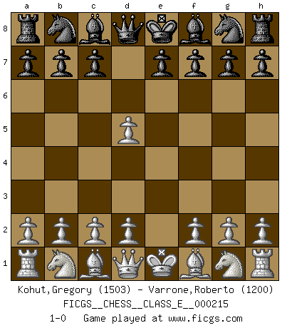 Last move : 1-0 2018 December 9 12:55:57 [Event "FICGS__CHESS__CLASS_E__000215"] [Site "FICGS"] [Date "2018.10.28"] [Round "1"] [White "Kohut,Gregory"] [Black "Varrone,Roberto"] [Result "1-0"] [WhiteElo "1503"] [BlackElo "1200"] 1.e4 d5 2.exd5 1-0 This chess game has been lost on time (started : 2018.10.28 19:13:57) Scandinavian (centre counter) defense Player White won this chess game. Follow this game move after move (download)It is not enough to be a good player... you must also play well. (Siegbert Tarrasch) Ich kenne keine einzige Person, die behaupten würde, Garri Kasparow sei ein guter Mensch (Nigel Short) Hay jugadores fuertes y personas amables y yo soy un jugador fuerte. (Bobby Fischer) Dans le domaine de la peinture, de la gravure et de la sculpture, dès la première décennie de notre siècle, les artistes abandonnent la représentation de la partie d'échecs pour se concentrer sur les pièces, sur les échiquiers et sur toutes les variations auxquelles les unes et les autres peuvent donner lieu. On passe en quelque sorte d'un thème social à un thème musical (au sens de la musica médiévale, c'est-à-dire d'une notion qui inclue le rythme, l'harmonie, la construction et la déconstruction, etc.). Graphiquement et picturalement, l'échiquier apparaît comme une structure ouverte, dynamique, d'une richesse infinie, autorisant toutes les combinatoires et débouchant sur des mouvements et des rythmes de nature exponentielle. (Michel Pastoureau) The real danger is not that computers will begin to think like men, but that men will begin to think like computers. (Sydney J. Harris)
