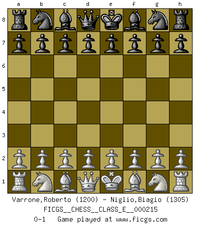 Last move : 0-1 2018 December 8 0:45:7 [Event "FICGS__CHESS__CLASS_E__000215"] [Site "FICGS"] [Date "2018.10.28"] [Round "1"] [White "Varrone,Roberto"] [Black "Niglio,Biagio"] [Result "0-1"] [WhiteElo "1200"] [BlackElo "1305"] 0-1 This chess game has been lost on time (started : 2018.10.28 19:13:57) Player Black won this chess game. Follow this game move after move (download)By this measure (on the gap between Fischer & his contemporaries), I consider him the greatest world champion. (Garry Kasparov) Spielt Blackmar-Diemer-Gambit, und das Matt kommt von selbst! (Emil Joseph Diemer) El Ajedrez es un juego terrible. Si no dominas el centro, tu oponente tiene una posición mas libre. Si tu tienes el centro, entonces realmente tienes algo de que preocuparte. (Siegbert Tarrasch) Toute estimation doit être constamment réévaluée. (Jacob Estrin) Tree pose grows confidence. It roots me to this world. (Terri Guillemets)