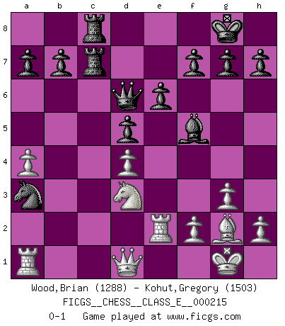 Last move : 0-1 2019 February 11 3:51:15 [Event "FICGS__CHESS__CLASS_E__000215"] [Site "FICGS"] [Date "2018.10.28"] [Round "1"] [White "Wood,Brian"] [Black "Kohut,Gregory"] [Result "0-1"] [WhiteElo "1288"] [BlackElo "1503"] 1.e4 c5 2.c3 Nf6 3.g3 Nxe4 4.Bg2 d5 5.d4 cxd4 6.cxd4 Bf5 7.Nc3 Nxc3 8.bxc3 e6 9.Ne2 Nd7 10.O-O Bd6 11.Bf4 Nb6 12.Bxd6 Qxd6 13.Re1 Rc8 14.a4 O-O 15.c4 Nxc4 16.Nf4 Rc7 17.Re2 Rfc8 18.Nd3 Na3 0-1 Sicilian : Alapin's variation (2.c3) Kingside Castling by player White (move 10) Kingside Castling by player Black (move 14) Player Black won this chess game. Follow this game move after move (download)It is difficult to play against Einstein's theory --on his first loss to Fischer. (Mikhail Tal) Ich bin Weltmeister und muß mit niemandem irgend etwas diskutieren. (Viswanathan Anand) Por la belleza de sus partidas, la claridad de su juego y lo brillante de sus ideas, Fischer se creó el mismo como un artista de la misma estatura como Brahms, Rembrandt y Shakespeare. (David Levy) Les sacrifices démontrent seulement que quelqu'un a gaffé. (Savielly Tartacover) How many people work in NATO Headquarters ? - About half of them. (Dirk Stikker, NATO general secretary)