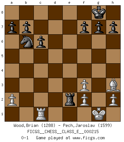 Last move : 0-1 2019 May 1 1:34:6 [Event "FICGS__CHESS__CLASS_E__000215"] [Site "FICGS"] [Date "2018.10.28"] [Round "1"] [White "Wood,Brian"] [Black "Pech,Jaroslav"] [Result "0-1"] [WhiteElo "1288"] [BlackElo "1599"] 1.e4 e5 2.Nf3 Nc6 3.Bc4 Bc5 4.c3 Nf6 5.d4 exd4 6.cxd4 Bb4+ 7.Bd2 Bxd2+ 8.Nbxd2 d5 9.exd5 Nxd5 10.O-O O-O 11.Re1 Nb6 12.Bf1 Nxd4 13.Nxd4 Qxd4 14.Nf3 Qxb2 15.Re2 Qf6 16.Re1 Bg4 17.Qb3 Bxf3 18.Qxf3 Qxf3 19.gxf3 Rfe8 20.Rxe8+ Rxe8 21.Rc1 c6 22.Bh3 Re2 0-1 Giuoco Piano Kingside Castling by player White (move 10) Kingside Castling by player Black (move 10) Player Black won this chess game. Follow this game move after move (download)Only sissies Castle. (Rob Sillars) Ich könnte leicht behaupten: Ja,ja, Leonid Breschnew wollte nicht, daß ich Weltmeister werde. In der Tat war die Sache komplizierter. (Viktor Kortschnoi) El Ajedrez no es como la vida... ¡tiene reglas!. (Mark Pasternak) Si le désir cupide (et stupide) de gagner est une inépuisable source de souffrance, une combinaison brillante sur l'échiquier est une découverte : le coquelicot qui s'épanouit lorsque apparaît la Voie Lactée. (Arrabal) There is a very easy way to return from a casino with a small fortune : go there with a large one. (Jack Yelton)