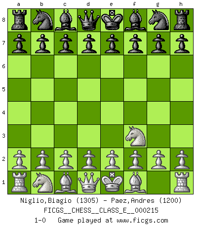 Last move : 1-0 2018 December 8 0:45:7 [Event "FICGS__CHESS__CLASS_E__000215"] [Site "FICGS"] [Date "2018.10.28"] [Round "1"] [White "Niglio,Biagio"] [Black "Paez,Andres"] [Result "1-0"] [WhiteElo "1305"] [BlackElo "1200"] 1.Nf3 1-0 This chess game has been lost on time (started : 2018.10.28 19:13:57) Reti Opening Player White won this chess game. Follow this game move after move (download)It's just you and your opponent at the board and you're trying to prove something. (Bobby Fischer) Darum geht es im Schach. Einen Tag gibst du deinem Gegner eine Lektion, am nächsten Tag gibt er dir eine. (Robert James Fischer) El Ajedrez es de 30 a 40 por ciento psicología. Uno no cuenta con esto cuando se juega contra una computadora. No lo puedo confundir. (Judith Polgar) Vous m'avez demandé de vous exposer quel est le fondement de la prière. Je ne fais que préparer les pièces du jeu sur la table... Nous sera-t-il permis d'en adopter les règles et si nous les appliquons scrupuleusement nous ne tarderons pas à faire mat le Roi divin ! Il ne pourra échapper à nos mains. (Sainte Thérèse d'Avila, Chemin de perfection) Children in the dark cause accidents, accidents in the dark cause children. (Unknown)