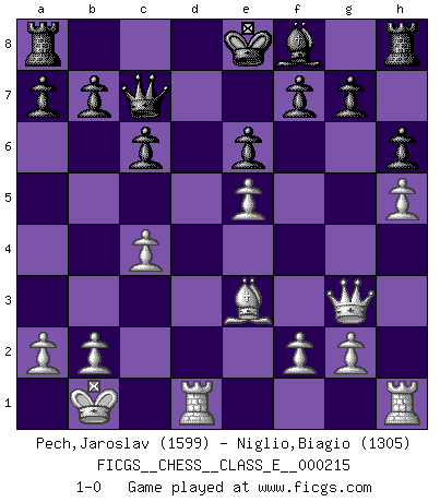 Last move : 1-0 2019 March 27 20:29:52 [Event "FICGS__CHESS__CLASS_E__000215"] [Site "FICGS"] [Date "2018.10.28"] [Round "1"] [White "Pech,Jaroslav"] [Black "Niglio,Biagio"] [Result "1-0"] [WhiteElo "1599"] [BlackElo "1305"] 1.e4 c6 2.d4 d5 3.Nc3 dxe4 4.Nxe4 Bf5 5.Ng3 Bg6 6.h4 h6 7.Nf3 Nd7 8.h5 Bh7 9.Bd3 Bxd3 10.Qxd3 e6 11.Bf4 Ngf6 12.O-O-O Be7 13.Kb1 Qa5 14.Ne5 Nxe5 15.dxe5 Nd5 16.Bd2 Qc7 17.c4 Nb6 18.Bf4 Nd7 19.Ne4 Nc5 20.Nxc5 Bxc5 21.Qg3 Bf8 22.Be3 1-0 Caro-Kann : Classical, 7...Nd7 Queenside Castling by player White (move 12) Player White won this chess game. Follow this game move after move (download)There just isn't enough televised Chess. (David Letterman) Im Wettkampf zwischen starken Meistern kommen Fehler sehr selten vor, deshalb ist es mit bloßem Warten nicht getan. (José Raúl Capablanca) Tu sabes, camarada Pachman, no disfruto el ser un Ministro, preferería jugar al Ajedrez como tu. (Che Guevara) Aux échecs, les retours au sommet sont rares : les dommages psychologiques consécutifs à une défaite sont trop sévères. (Daily Telegraph) Life is like a ten-speed bicycle: most of us have gears we never use. (Charles M. Schulz)