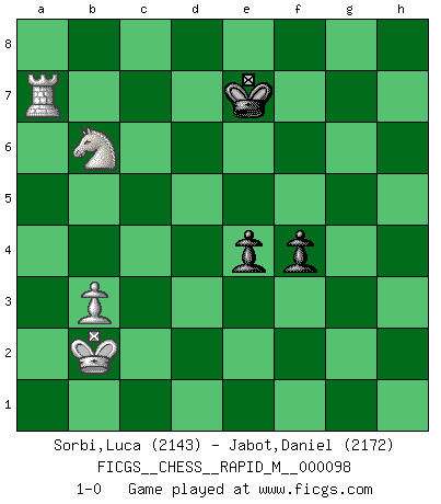 Last move : 1-0 2019 April 8 10:55:32 [Event "FICGS__CHESS__RAPID_M__000098"] [Site "FICGS"] [Date "2018.10.29"] [Round "1"] [White "Sorbi,Luca"] [Black "Jabot,Daniel"] [Result "1-0"] [WhiteElo "2143"] [BlackElo "2172"] 1.e4 c5 2.Nf3 d6 3.d4 cxd4 4.Nxd4 Nf6 5.Nc3 Nc6 6.Bg5 a6 7.Qd2 e6 8.O-O-O Bd7 9.f4 b5 10.Bxf6 gxf6 11.Kb1 Qb6 12.Nxc6 Qxc6 13.f5 h5 14.Qf4 Bh6 15.Qf3 Ke7 16.Bd3 b4 17.Ne2 e5 18.Qxh5 Qc5 19.Qf3 Bc6 20.h4 Qe3 21.Nc1 a5 22.Rde1 Qc5 23.g4 Rhg8 24.g5 Bg7 25.h5 a4 26.Ne2 Rae8 27.Ref1 a3 28.b3 d5 29.h6 Bh8 30.exd5 Bxd5 31.Be4 Rc8 32.c4 bxc3 33.Bxd5 c2+ 34.Kc1 Rgd8 35.Bc4 Qb4 36.Qc3 Rxc4 37.Qxb4+ Rxb4 38.g6 Re4 39.Nc3 Re3 40.Nb5 fxg6 41.fxg6 Rg3 42.g7 Bxg7 43.hxg7 Rxg7 44.Rh2 Ra8 45.Rxc2 Ra6 46.Nc3 Kf7 47.Nd5 Rd6 48.Rc7+ Kf8 49.Rc8+ Kf7 50.Ne3 Rg5 51.Ra8 Rg3 52.Ra7+ Ke6 53.Nc4 Rc3+ 54.Kb1 Rc6 55.Ra8 Ke7 56.Nxa3 Rb6 57.Kb2 Rc5 58.Ra4 Rbc6 59.Rh4 Re6 60.Rh7+ Ke8 61.Nc4 R5c6 62.a4 e4 63.Rfh1 Re7 64.Rxe7+ Kxe7 65.a5 f5 66.Ra1 f4 67.a6 Rc8 68.a7 Ra8 69.Nb6 Rxa7 70.Rxa7+ 1-0 Sicilian : Richter-Rauzer Queenside Castling by player White (move 8) 10 pieces endgame at move 64 : White KRRNPP , Black KRPP WHITE : King + 2 Rooks 1 Knight 2 Pawns BLACK : King + 1 Rook 2 Pawns 9 pieces endgame at move 64 : White KRNPP , Black KRPP WHITE : King + 1 Rook 1 Knight 2 Pawns BLACK : King + 1 Rook 2 Pawns 8 pieces endgame at move 69 : White KRNP , Black KRPP WHITE : King + 1 Rook 1 Knight 1 Pawn BLACK : King + 1 Rook 2 Pawns 7 pieces endgame at move 70 : White KRNP , Black KPP WHITE : King + 1 Rook 1 Knight 1 Pawn BLACK : King + 2 Pawns Player White won this chess game. Follow this game move after move (download)Best by test: 1. e4 (Bobby Fischer) Fischer machte Schach einfach zu einer aufregenden Sache, wann immer er sich ans Brett setzte. (Raymond Keene) Una de estas pequeñas movidas modestas pudieran ser mas molestas a tu oponente que la amenaza mas grande. (Siegbert Tarrasch) RxDa4 pat (...) A married woman is like a fish riding a bicycle. (Rodolfo d'Ettorre)