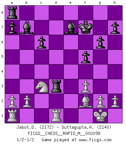 Last move : 1/2-1/2 2019 January 13 20:23:56 [Event "FICGS__CHESS__RAPID_M__000098"] [Site "FICGS"] [Date "2018.10.29"] [Round "1"] [White "Jabot,Daniel"] [Black "Duttagupta,Aniruddha"] [Result "1/2-1/2"] [WhiteElo "2172"] [BlackElo "2140"] 1.e4 c6 2.d4 d5 3.exd5 cxd5 4.Nf3 Nc6 5.c4 Nf6 6.Nc3 g6 7.cxd5 Nxd5 8.Qb3 Nxc3 9.Bc4 Nd5 10.Bxd5 e6 11.Bxc6+ bxc6 12.O-O Qd5 13.Qc3 f6 14.Be3 Bb7 15.Rfc1 Be7 16.Ne1 Kf7 17.f3 Rhd8 18.Nd3 e5 19.Nb4 exd4 20.Nxd5 dxc3 21.Nxc3 Rd3 22.Bf2 f5 23.Rd1 1/2-1/2 Caro-Kann : Exchange variation Kingside Castling by player White (move 12) This chess game ended in a draw. Follow this game move after move (download)It is no time to be playing Chess when the house is on fire. (Italian Proverb) Schach ist ein schwarz-weisser Dschungel. (Garry Kasparov) El Ajedrez es sobre todo, ¡una pelea!. (Emanuel Lasker) Les sacrifices démontrent seulement que quelqu'un a gaffé. (Savielly Tartacover) The smarter you play, the luckier you'll be. (Mark Pilarski)