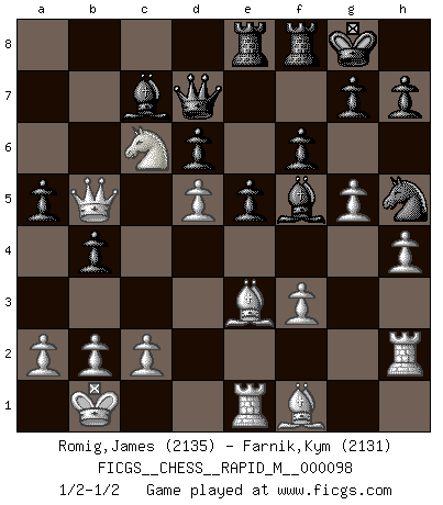 Last move : 1/2-1/2 2018 November 11 5:11:17 [Event "FICGS__CHESS__RAPID_M__000098"] [Site "FICGS"] [Date "2018.10.29"] [Round "1"] [White "Romig,James"] [Black "Farnik,Kym"] [Result "1/2-1/2"] [WhiteElo "2135"] [BlackElo "2131"] 1.e4 c5 2.Nf3 d6 3.d4 cxd4 4.Nxd4 Nf6 5.Nc3 a6 6.Be3 e5 7.Nb3 Be6 8.f3 Be7 9.Qd2 Nbd7 10.g4 O-O 11.g5 Nh5 12.O-O-O b5 13.Kb1 Nb6 14.Nd5 Nxd5 15.exd5 Bf5 16.Na5 f6 17.h4 Qd7 18.Rh2 Rae8 19.Nc6 Bd8 20.Qb4 Ng3 21.Bg2 Nh5 22.Qa3 a5 23.Bf1 b4 24.Qa4 Bc7 25.Qb5 Qf7 26.Re1 Qd7 1/2-1/2 Sicilian : Najdorf, Byrne (English) attack Kingside Castling by player Black (move 10) Queenside Castling by player White (move 12) This chess game ended in a draw. Follow this game move after move (download)Without error there can be no brilliancy. (Emanuel Lasker) Ich kämpfe solange mein Gegner einen Fehler machen kann. (Emanuel Lasker) Debió haber existido una vez en que los hombres eran semidióses, de otra manera no hubiesen podido inventar el Ajedrez. (Gustav Schenk) Des combinaisons [dans le jeu d'échecs] pareilles à des mélodies. Je crois entendre pour ainsi dire la musique des coups... (Vladimir Nabokov) I've lost money so fast in these clubs it's left me reeling. I've read every poker book ever written, but the only way to get better at the game is to go out and play with people who are really good. The problem is, you stand to lose a lot of money doing it. (Matt Damon)