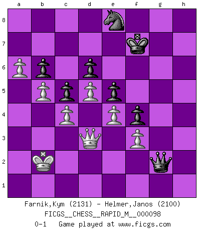 Last move : 0-1 2019 January 27 11:59:5 [Event "FICGS__CHESS__RAPID_M__000098"] [Site "FICGS"] [Date "2018.10.29"] [Round "1"] [White "Farnik,Kym"] [Black "Helmer,Janos"] [Result "0-1"] [WhiteElo "2131"] [BlackElo "2100"] 1.d4 Nf6 2.c4 g6 3.Nc3 Bg7 4.e4 d6 5.Nf3 O-O 6.Be2 e5 7.O-O Nc6 8.d5 Ne7 9.Ne1 Nd7 10.Nd3 f5 11.f3 f4 12.Bd2 g5 13.b4 Nf6 14.Nf2 h5 15.h3 Rf7 16.a4 Bf8 17.a5 Ng6 18.b5 Rg7 19.Be1 Nh8 20.Kh2 g4 21.fxg4 hxg4 22.Nxg4 Nxg4+ 23.hxg4 Rh7+ 24.Kg1 Nf7 25.Bf3 Nh6 26.Bd2 Be7 27.Kf2 Bh4+ 28.Ke2 Nxg4 29.Qb1 Bd7 30.Rh1 Qg5 31.Nd1 Nf6 32.Nc3 Qg6 33.Qg1 c5 34.Kd3 Kf7 35.Qf1 Rah8 36.Qe2 Bg3 37.Rxh7+ Rxh7 38.a6 b6 39.Rg1 Rh2 40.Be1 Bxe1 41.Qxe1 Bg4 42.Rh1 Qh5 43.Rxh2 Qxh2 44.Qe2 Bxf3 45.gxf3 Qh1 46.Na4 Nh7 47.Nxb6 axb6 48.Kc3 Nf6 49.Kb2 Ne8 50.Qd3 Qg2+ 0-1 King's Indian : Orthodox, Aronin-Taimanov variation (Yugoslav attack / Mar del Plata variation) Kingside Castling by player Black (move 5) Kingside Castling by player White (move 7) Player Black won this chess game. Follow this game move after move (download)The passed pawn is a criminal, who should be kept under lock and key. Mild measures, such as police surveillance, are not sufficient. (Nimzovitch) Wenn ich mich einlogge, glauben die Leute gewöhnlich nicht, dass ich es selbst bin und sie fangen an, mir dumme Fragen zu stellen. Und wenn sie es glauben, stellen sie wieder andere dumme Fragen. (Judith Polgar) En el tablero, la mentira e hipocresía no sobreviven mucho. (Emanuel Lasker) Shah mat. Le roi est mort. Cri de fierté d'un joueur venant de terrasser son adversaire, courtoisement, sans effusion de sang. The worth of a book is to be measured by what you can carry away from it. (James Bryce)
