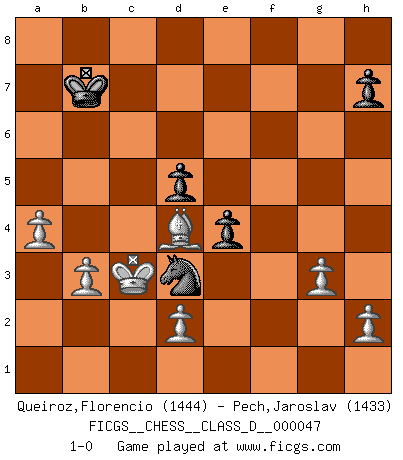 Last move : 1-0 2008 February 17 22:11:29 [Event "FICGS__CHESS__CLASS_D__000047"] [Site "FICGS"] [Date "2007.05.23"] [Round "1"] [White "Queiroz,Florencio"] [Black "Pech,Jaroslav"] [Result "1-0"] [WhiteElo "1444"] [BlackElo "1433"] 1.e4 e5 2.Nf3 Nc6 3.Bb5 f5 4.Nc3 fxe4 5.Nxe4 d5 6.Nxe5 dxe4 7.Nxc6 Qg5 8.Qe2 Nf6 9.f4 Qxf4 10.Nxa7 Bd7 11.Bxd7+ Kxd7 12.Qb5+ Ke6 13.Qb3+ Kd7 14.Qxb7 Bd6 15.Qb5+ Ke6 16.Qb3+ Kd7 17.Qf7+ Be7 18.Nc6 Kxc6 19.Qxe7 Nd5 20.Qe6+ Qd6 21.Qxd6+ cxd6 22.b3 Nb4 23.Kd1 Rhc8 24.a4 Kb6 25.Bb2 Nxc2 26.Rc1 Nb4 27.Rxc8 Rxc8 28.Bxg7 Rg8 29.Bd4+ Kc6 30.g3 Nd3 31.Rf1 Rb8 32.Kc2 Kd5 33.Bc3 Kc6 34.Rf7 Rb7 35.Rxb7 Kxb7 36.Bd4 d5 37.Kc3 1-0 Ruy Lopez : Schliemann defense, Berger variation Player White won this chess game. Follow this game move after move (download)Becoming successful at Chess allows you to discover your own personality. That's what I want for the kids I teach. (Saudin Robovic) Kleine Schachspieler machen Mist, und große Schachspieler machen Mist, aber große machen weniger Mist. (Fritz Sämisch) Preferería tener un Peón que un dedo. (Reuben Fine) Dans le domaine de la peinture, de la gravure et de la sculpture, dès la première décennie de notre siècle, les artistes abandonnent la représentation de la partie d'échecs pour se concentrer sur les pièces, sur les échiquiers et sur toutes les variations auxquelles les unes et les autres peuvent donner lieu. On passe en quelque sorte d'un thème social à un thème musical (au sens de la musica médiévale, c'est-à-dire d'une notion qui inclue le rythme, l'harmonie, la construction et la déconstruction, etc.). Graphiquement et picturalement, l'échiquier apparaît comme une structure ouverte, dynamique, d'une richesse infinie, autorisant toutes les combinatoires et débouchant sur des mouvements et des rythmes de nature exponentielle. (Michel Pastoureau) Quotation,n.: The act of repeating erroneously the words of another. The words erroneously repeated. (Ambrose Bierce, The Devil's Dictionary)