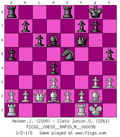 Last move : 1/2-1/2 2018 November 19 23:49:29 [Event "FICGS__CHESS__RAPID_M__000098"] [Site "FICGS"] [Date "2018.10.29"] [Round "1"] [White "Helmer,Janos"] [Black "Cleto Junior,Dirceu"] [Result "1/2-1/2"] [WhiteElo "2100"] [BlackElo "2261"] 1.Nf3 d5 2.g3 Bg4 3.Bg2 Nd7 4.c4 e6 5.cxd5 exd5 6.O-O Ngf6 7.Nc3 c6 8.d3 Bd6 9.h3 Bxf3 10.Bxf3 d4 11.Ne4 Nxe4 12.Bxe4 O-O 13.Bd2 a5 14.Bg2 Re8 15.Re1 Ne5 16.Qc2 Qf6 17.Rf1 h5 1/2-1/2 Reti : King's Indian attack, Keres variation Kingside Castling by player White (move 6) Kingside Castling by player Black (move 12) This chess game ended in a draw. Follow this game move after move (download)When asked, -How is that you pick better moves than your opponents?, I responded: I'm very glad you asked me that, because, as it happens, there is a very simple answer. I think up my own moves, and I make my opponent think up his. (Alexander Alekhine) Der Umstand, daß uns eine 7 Stunden Zeitkontrolle ermöglicht eine großartige, tiefe Partie zu spielen, ist für die Massenmedien nicht weiter von Bedeutung. (Alexej Shirov) Después de la respuesta de las negras a 1.e4 con 1..e5, se quedan siempre tratando de entrar dentro del juego. (Howard Staunton) Vous n'êtes pas toujours obligé de jouer le meilleur coup. Un coup doit être actif, entreprenant, correct et beau ! (David Bronstein) Opportunities multiply as they are seized. (Sun Tzu)