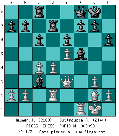 Last move : 1/2-1/2 2019 February 20 2:6:22 [Event "FICGS__CHESS__RAPID_M__000098"] [Site "FICGS"] [Date "2018.10.29"] [Round "1"] [White "Helmer,Janos"] [Black "Duttagupta,Aniruddha"] [Result "1/2-1/2"] [WhiteElo "2100"] [BlackElo "2140"] 1.Nf3 d5 2.g3 Bg4 3.Bg2 Nd7 4.d4 e6 5.O-O Ngf6 6.Nbd2 c6 7.c4 Bd6 8.Re1 O-O 9.e4 dxe4 10.Nxe4 Nxe4 11.Rxe4 Nf6 12.Re1 Re8 13.Qb3 Qb6 14.Bd2 h6 15.Qc3 Qd8 16.Ne5 Bf5 17.Rad1 Qe7 18.Qc1 Nd7 19.Nf3 Nf6 20.Ne5 Nd7 21.Nf3 Rac8 22.Bc3 Nf6 23.Ne5 Nd7 24.Nd3 Red8 25.f4 Qf8 26.Ne5 Nxe5 27.fxe5 Be7 28.Qe3 Rd7 29.Rf1 Bb4 30.Rd2 Bxc3 1/2-1/2 Reti : King's Indian attack, Keres variation Kingside Castling by player White (move 5) Kingside Castling by player Black (move 8) This chess game ended in a draw. Follow this game move after move (download)Blessed be the memory of him who gave the world this immortal game. (A. G. Gardiner) Ich bin Weltmeister und muß mit niemandem irgend etwas diskutieren. (Viswanathan Anand) El Ajedrez es un terrible juego. Si no controlas el centro, tu oponente tiene una posición mas holgada. Si tienes control del centro, ¡entonces realmente tu tienes algo de que preocuparte!. (Siegbert Tarrasch) Il a essayé de se convaincre qu'il pourrait empêcher toutes les erreurs et ne jamais perdre. L'horreur ! Gary Kasparov au sujet de Robert Fischer. There are two types of people in this world, good and bad. The good sleep better, but the bad seem to enjoy the waking hours much more. (Woody Allen)